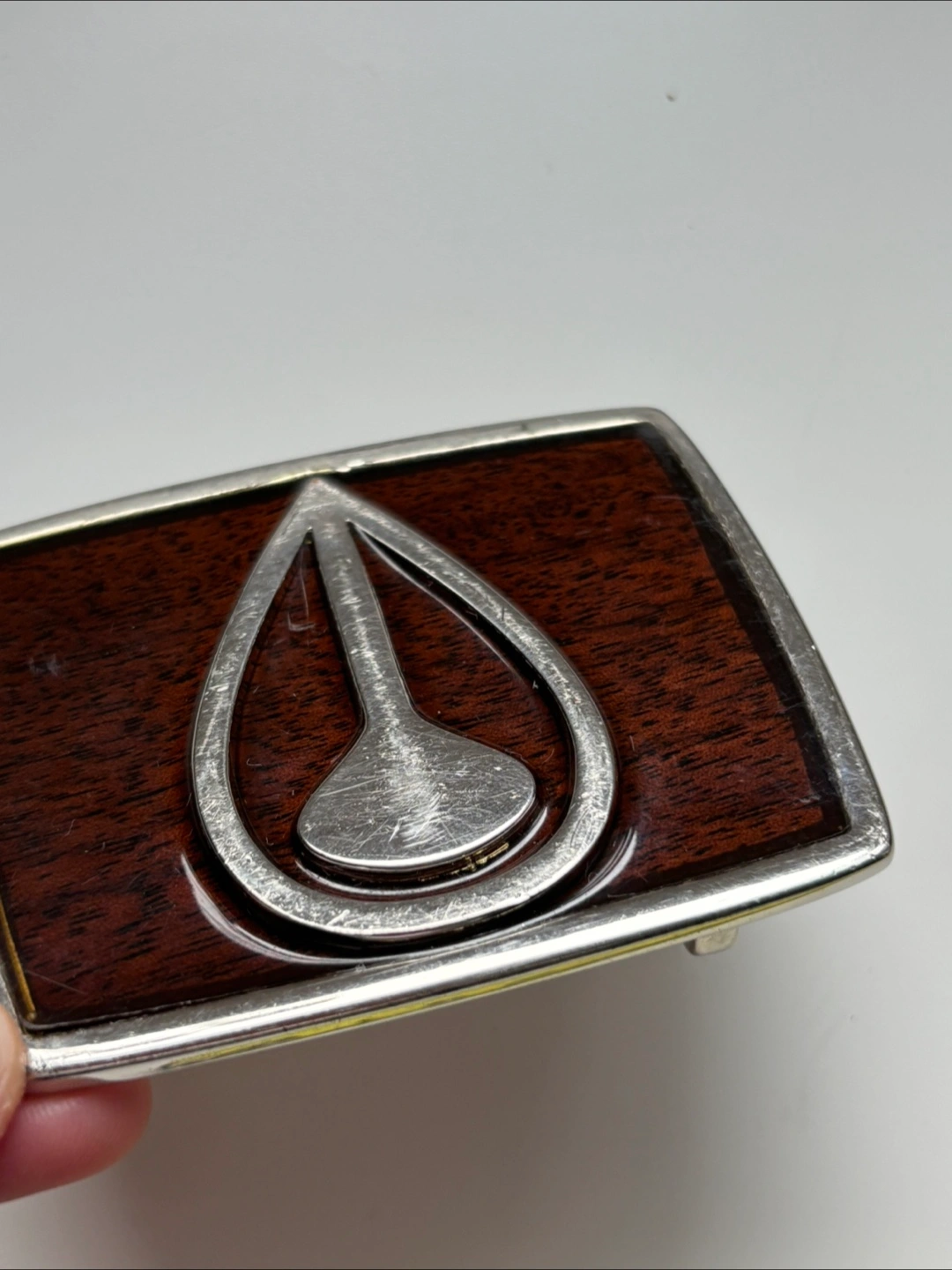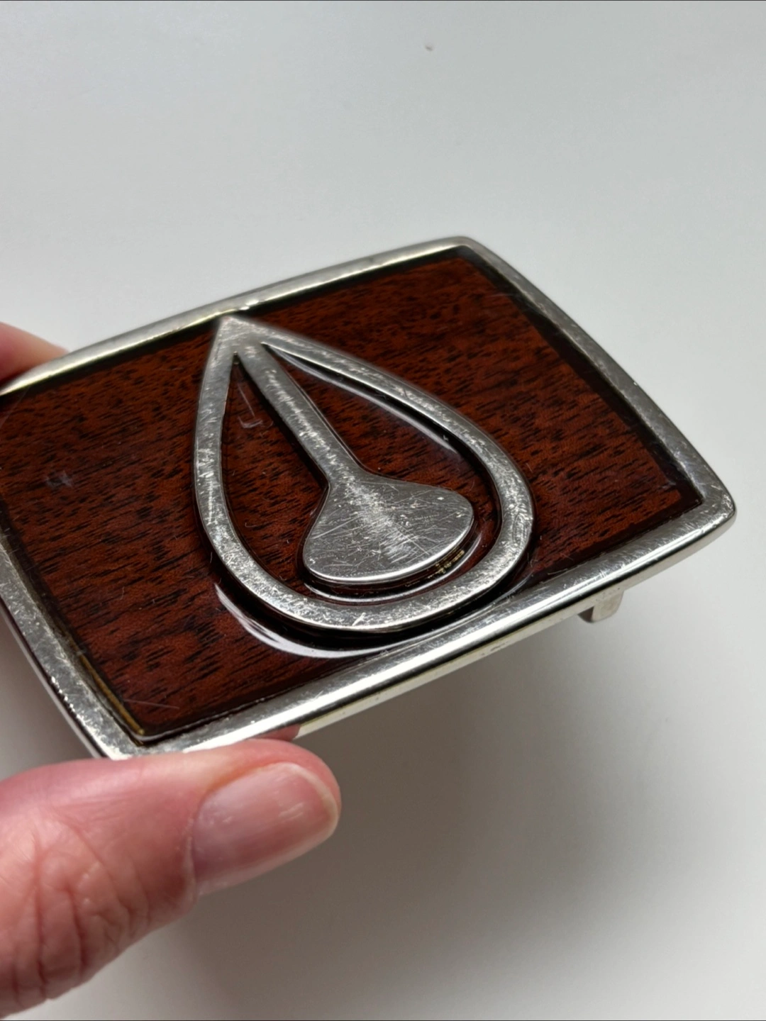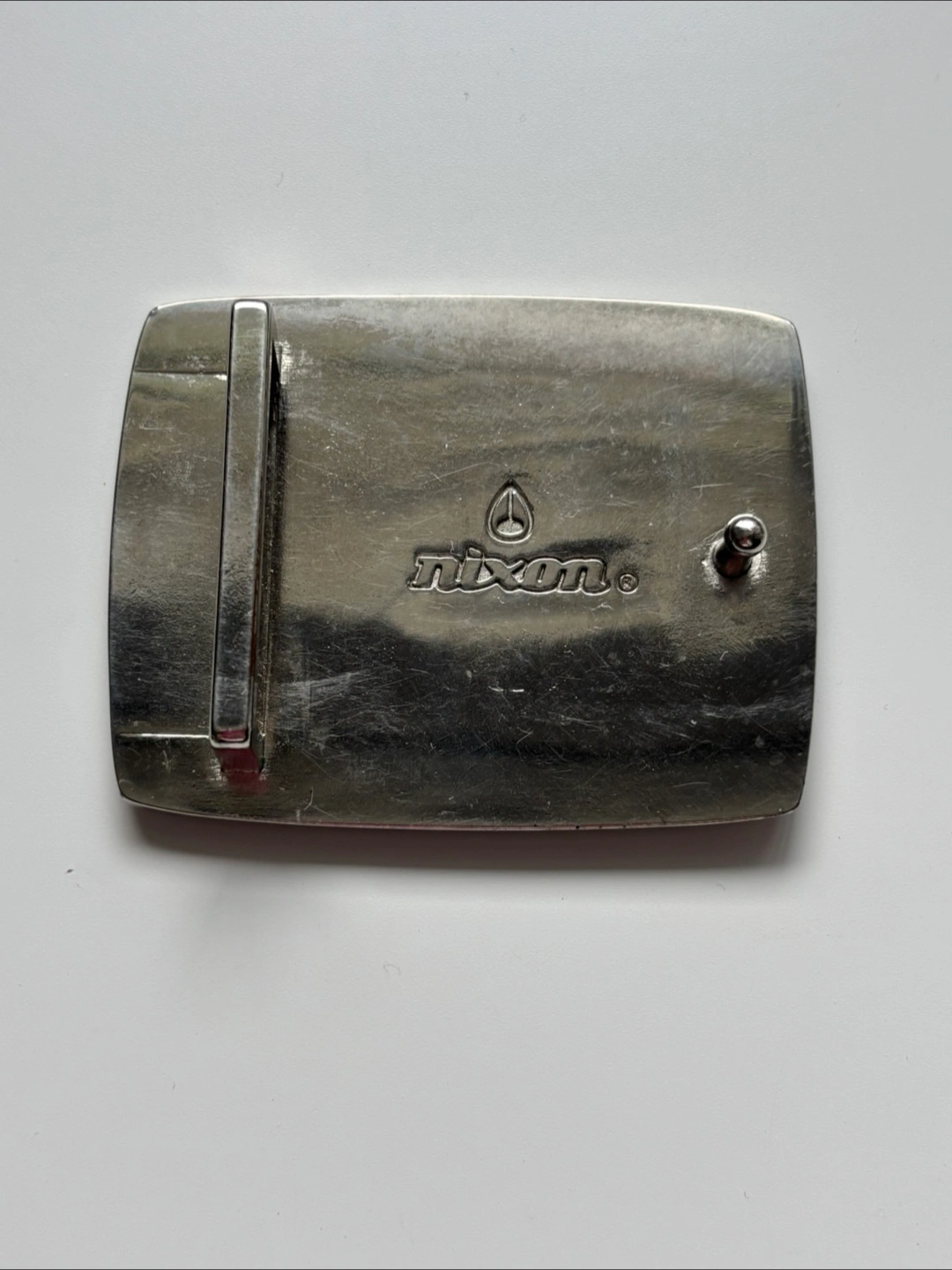 117Here's a Nixon belt buckle! It has a wood-grain look with a metal Nixon logo on the front. The back is silver metal with the Nixon logo engraved as well. It's about 3 inches wide.
