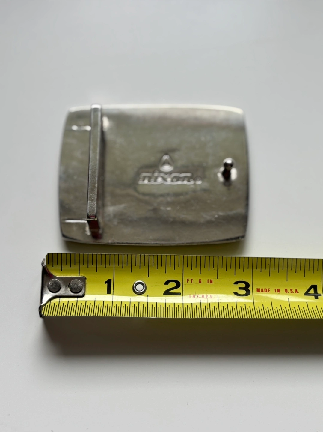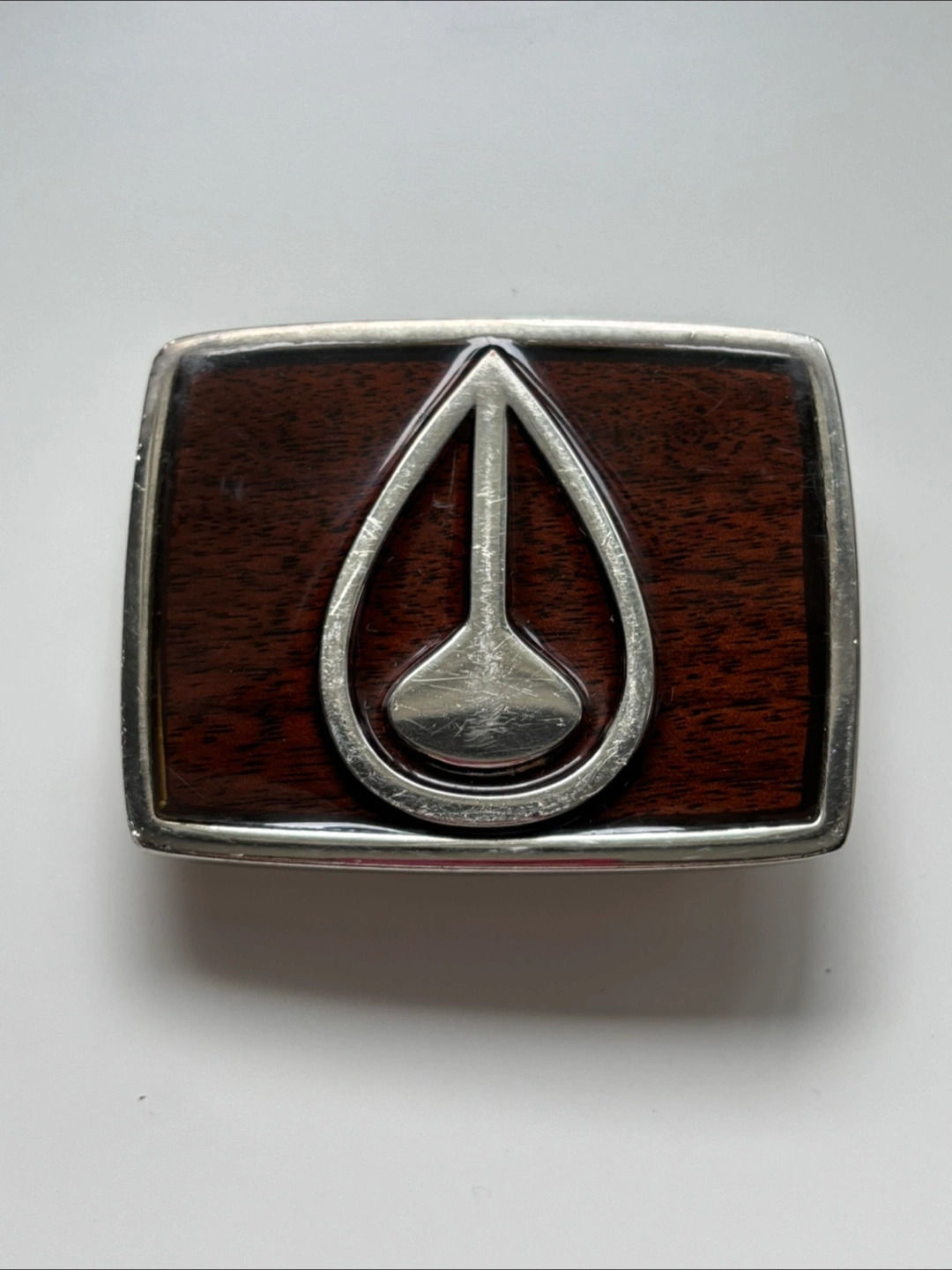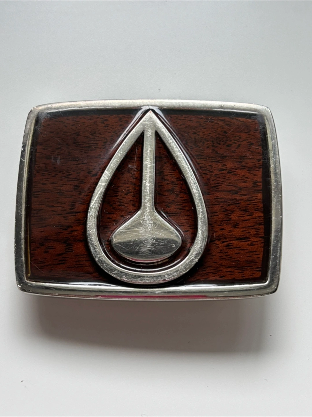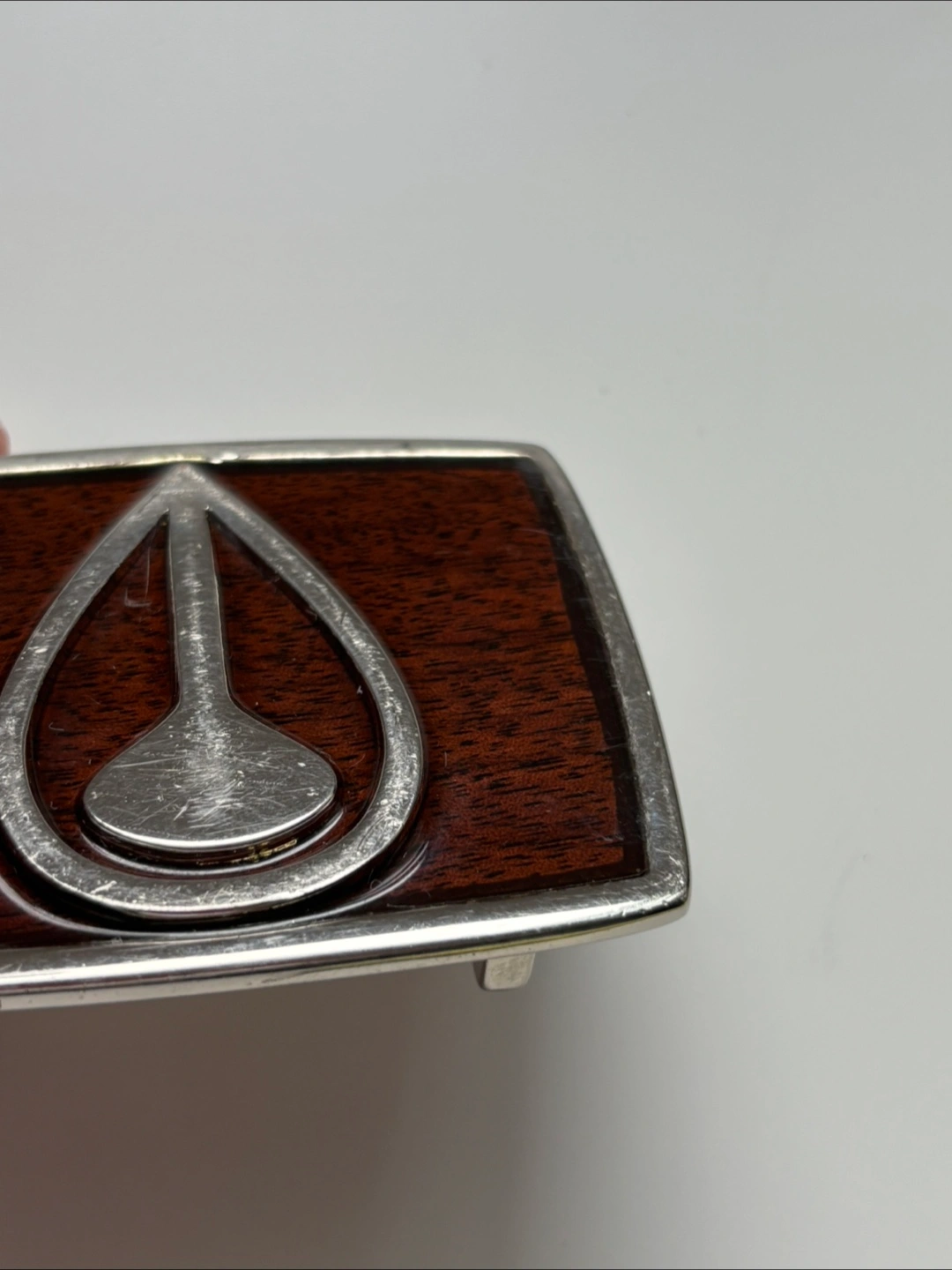 117Here's a Nixon belt buckle! It has a wood-grain look with a metal Nixon logo on the front. The back is silver metal with the Nixon logo engraved as well. It's about 3 inches wide.