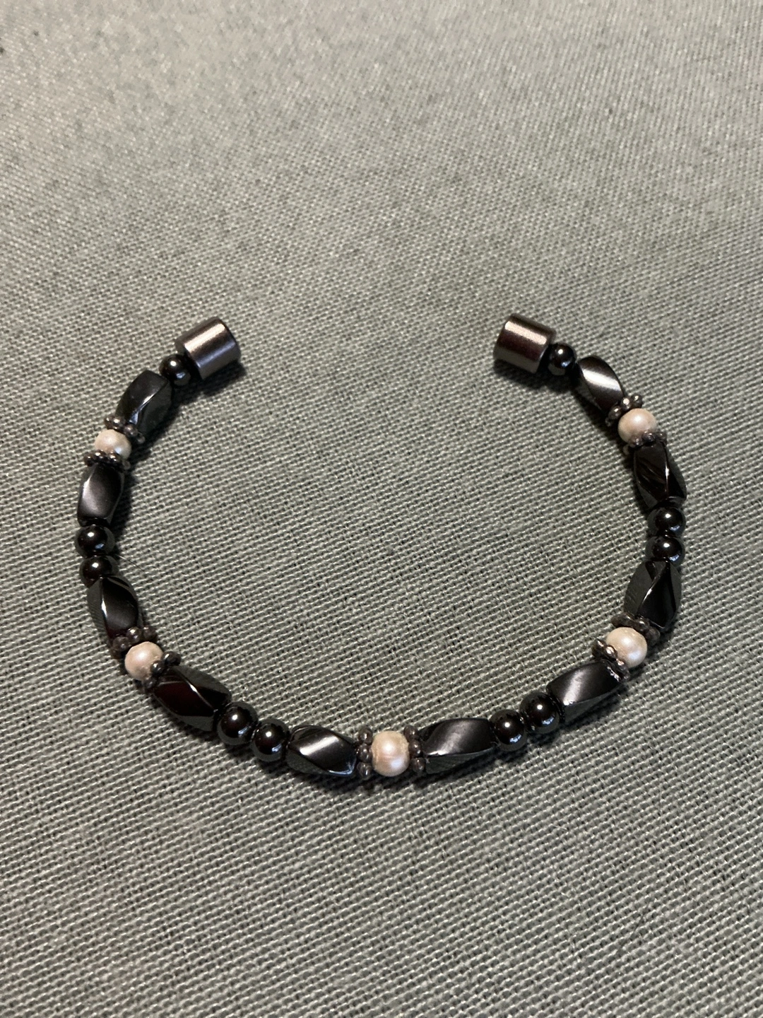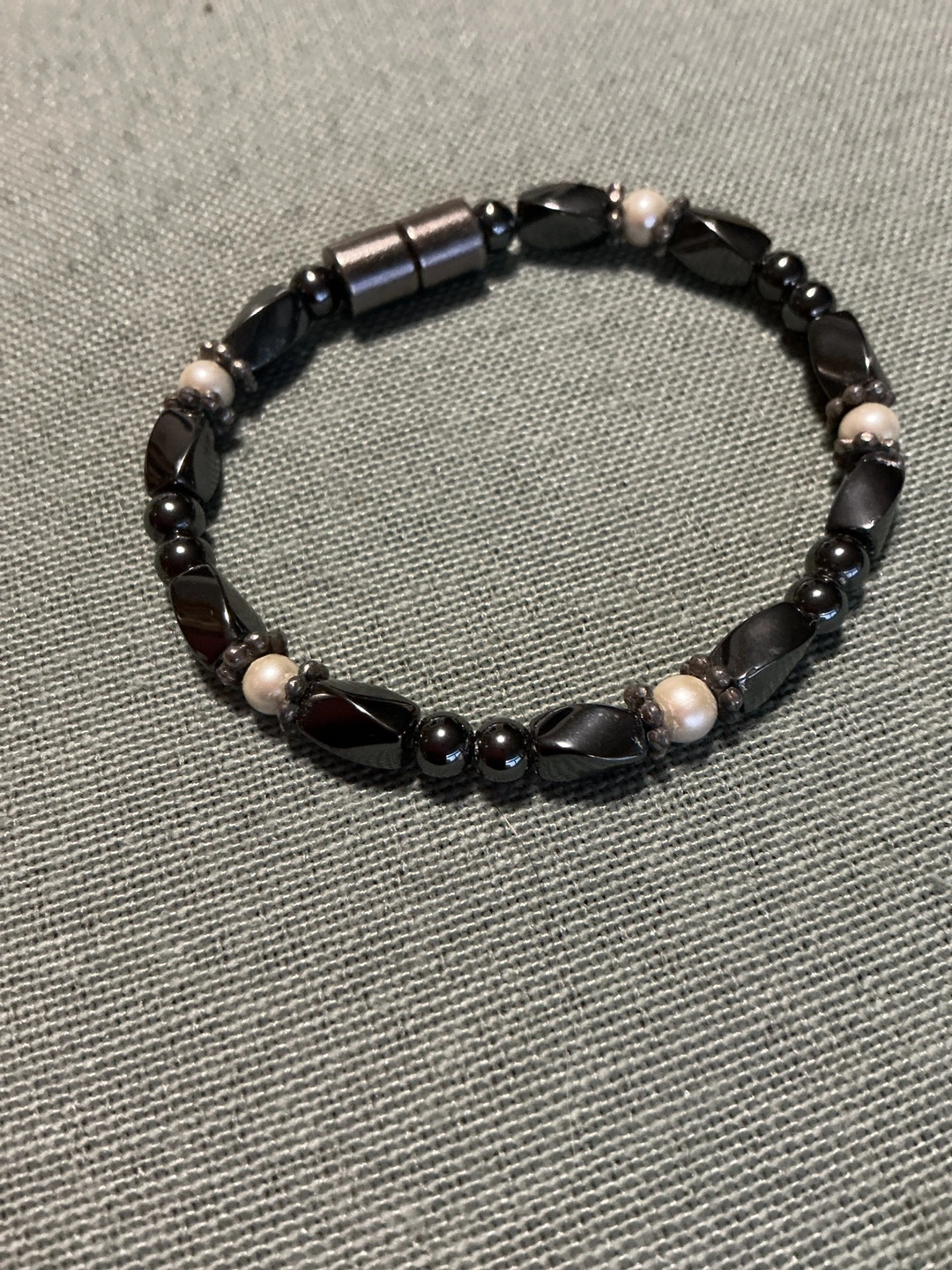 Here's a stylish bracelet featuring hematite and pearl beads. It has a magnetic clasp, making it easy to put on and take off. A lovely accessory to add to your collection! Small wrist.