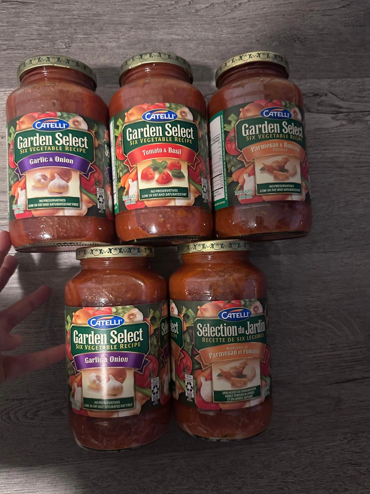 Selling a variety of Catelli Garden Select pasta sauces! Flavours include Garlic & Onion, Tomato & Basil, and Parmesan & Romano. Perfect for a quick and tasty meal!