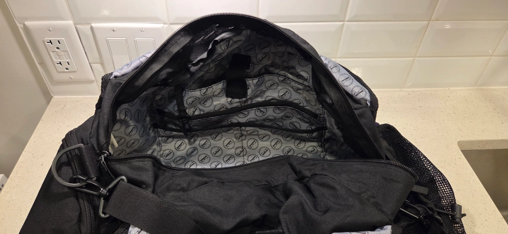 Excellent gym bag, used for yoga classes, my mat wrapped in below the side handles. Fits gym outfit, shoes, extra clothes and toiletries easily for day to day workouts.