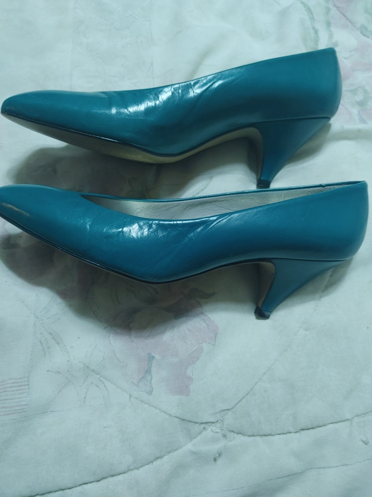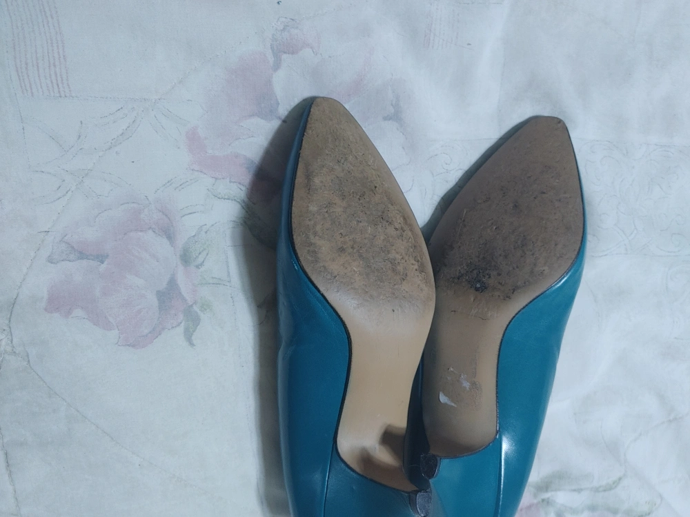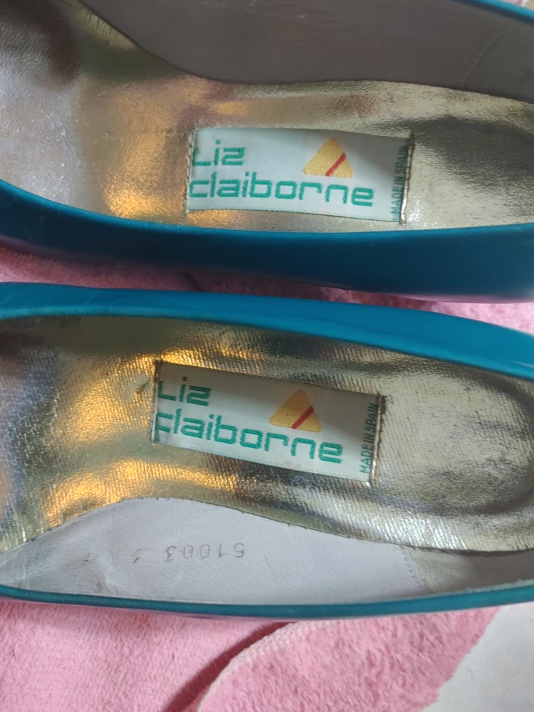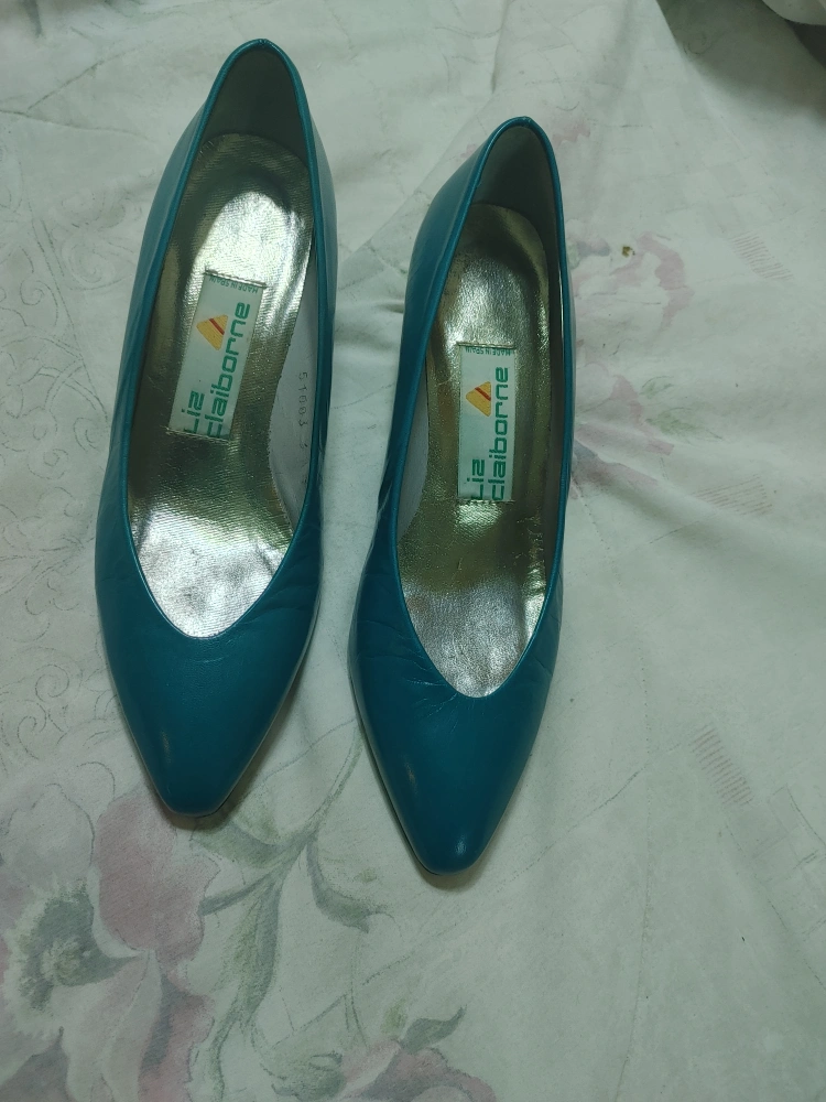Selling a pair of Liz Claiborne heels in a teal colour. They are made of leather and show some signs of wear on the soles.