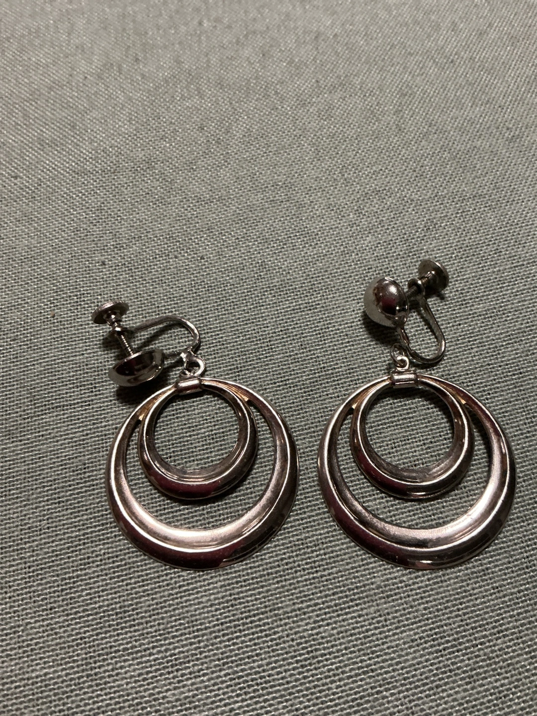 These are a pair of silver-tone clip-on earrings featuring a double hoop design. They're in good condition and have a classic look that would complement any outfit