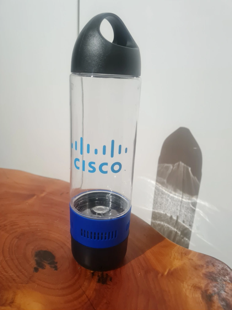 Selling a Cisco water bottle that comes with a built-in speaker! It's clear with a blue Cisco logo and a black lid. The speaker component is blue and black and detaches for easy washing. A fun way to stay hydrated and enjoy your tunes. Never used.