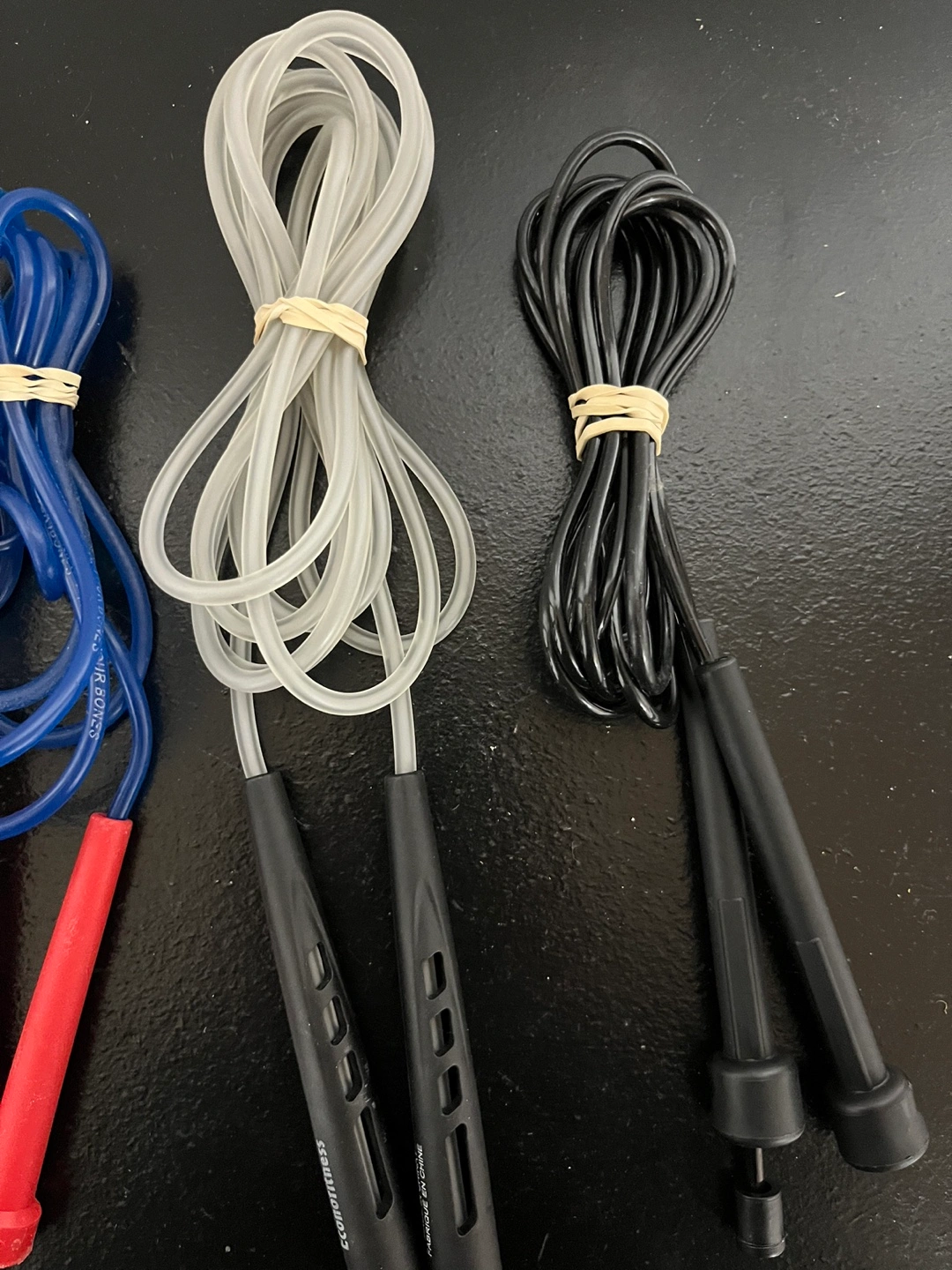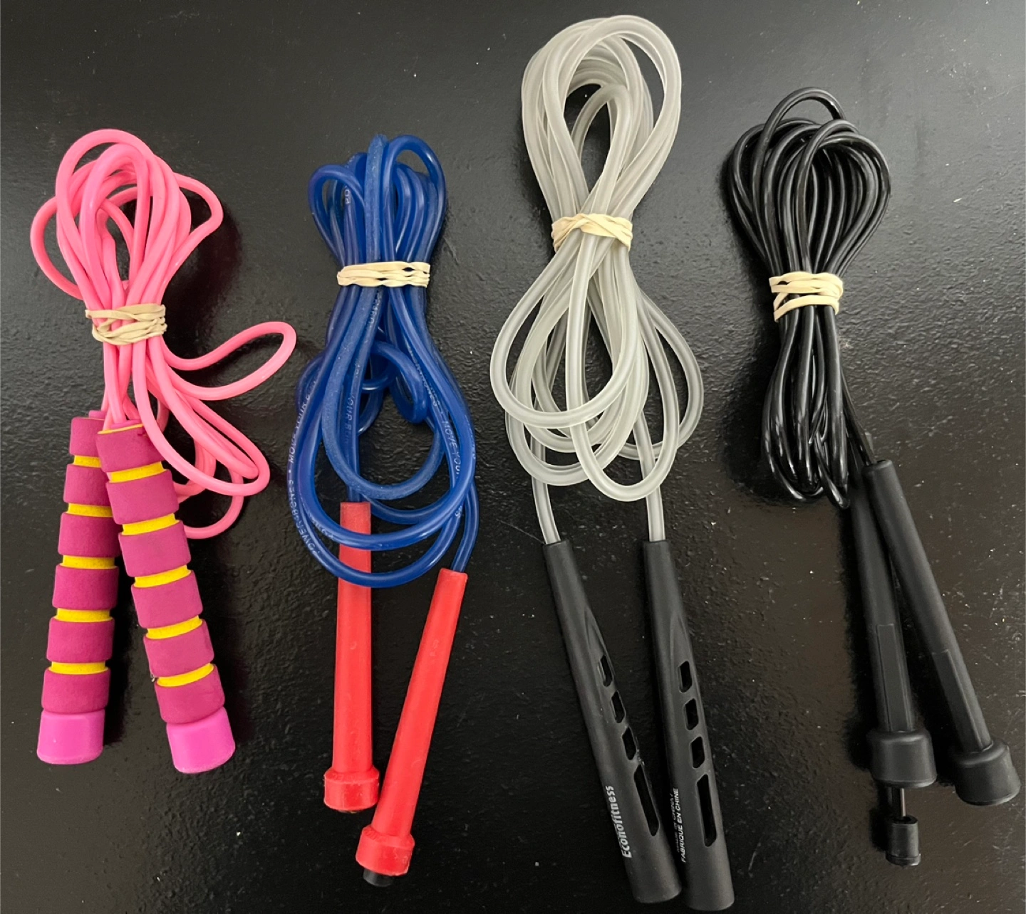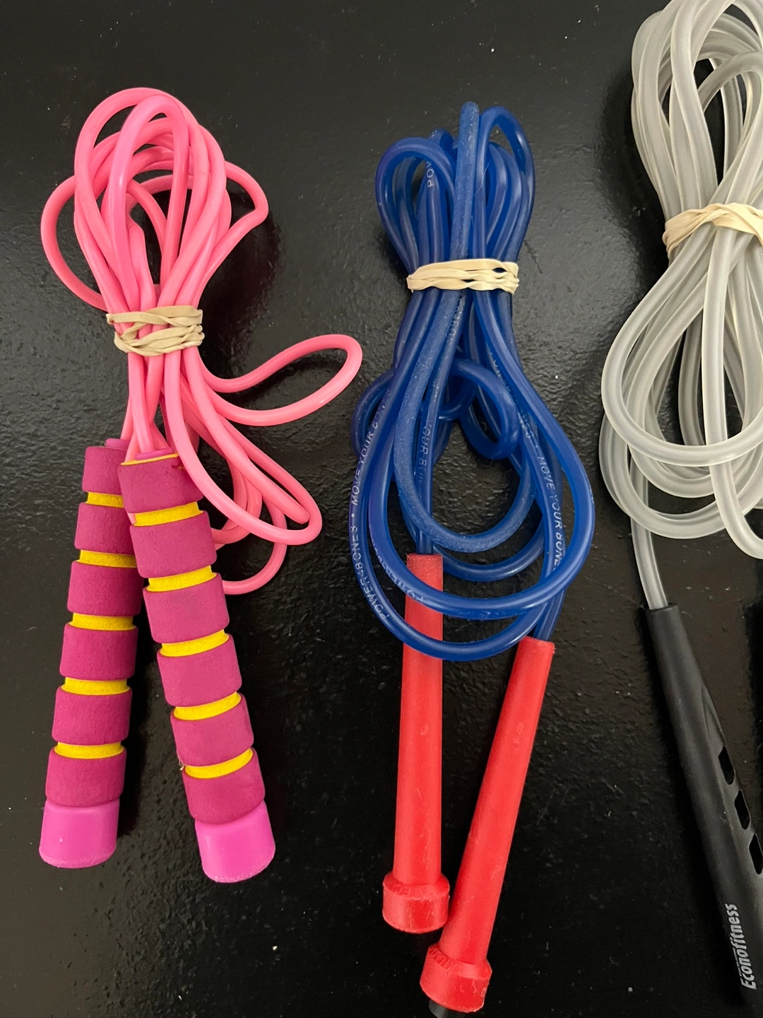 Selling a set of skipping ropes in various colours! There's pink, blue, grey and black available. Great for fitness!