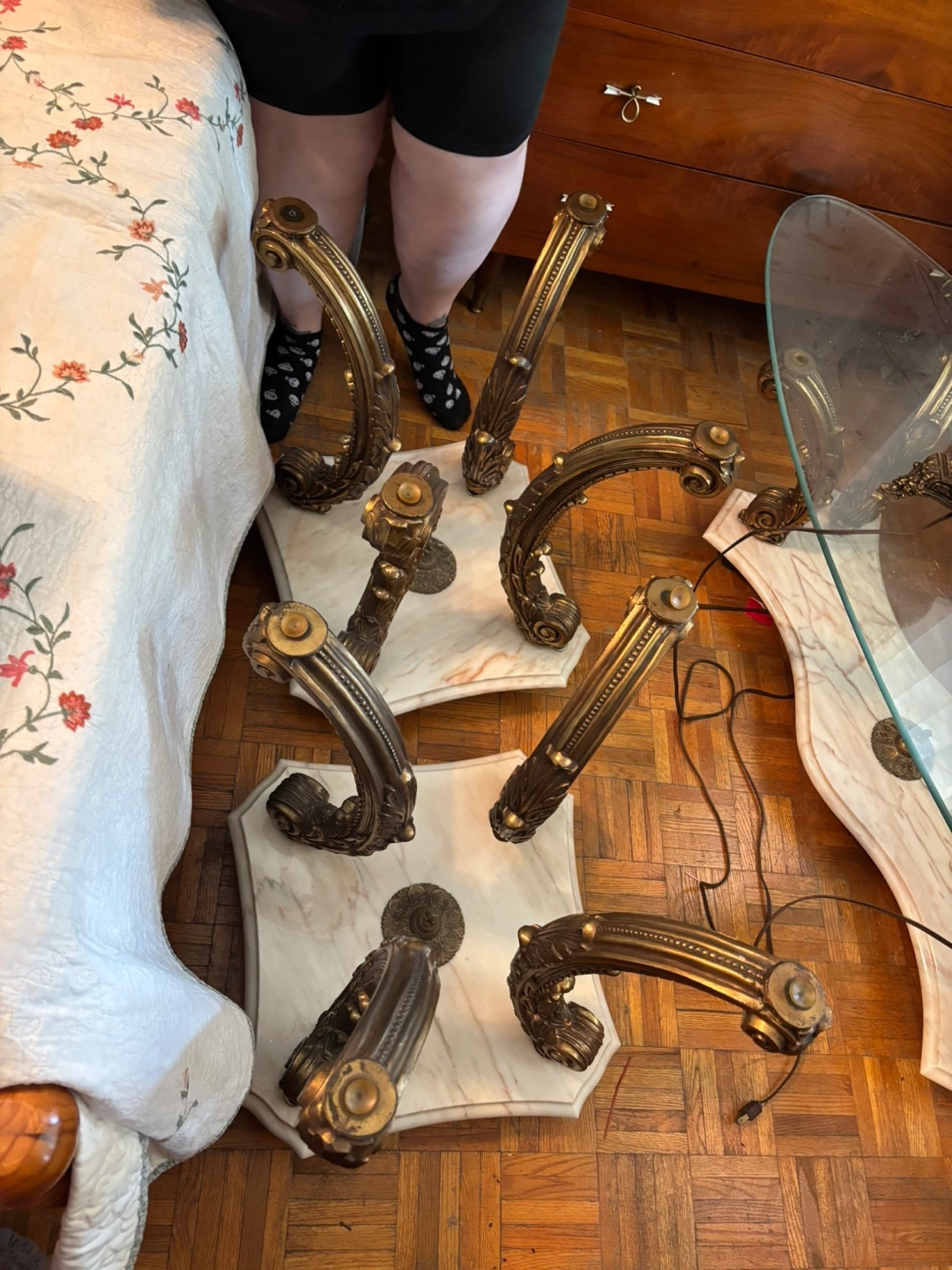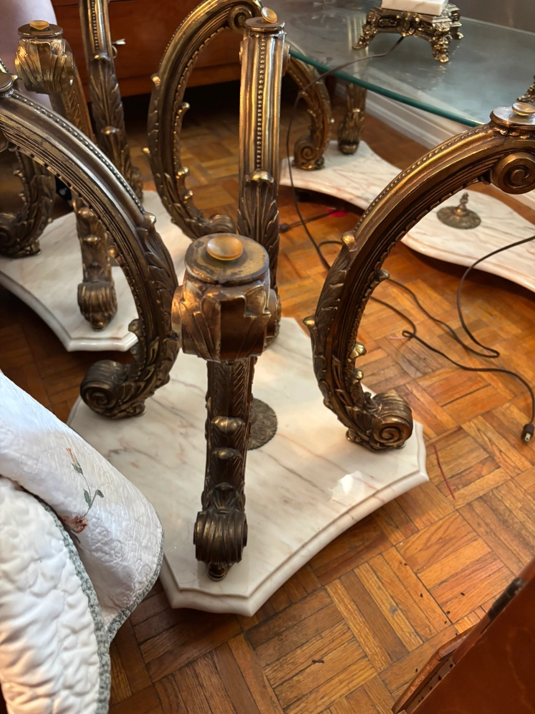 Selling two antique side tables with a marble base and bronze-coloured accents! It's a unique piece that would add a touch of elegance to any room. The tables features a sturdy construction and intricate detailing on the bronze-coloured parts. Perfect for displaying your favourite items or as a stylish addition to your living space. square glass top included
