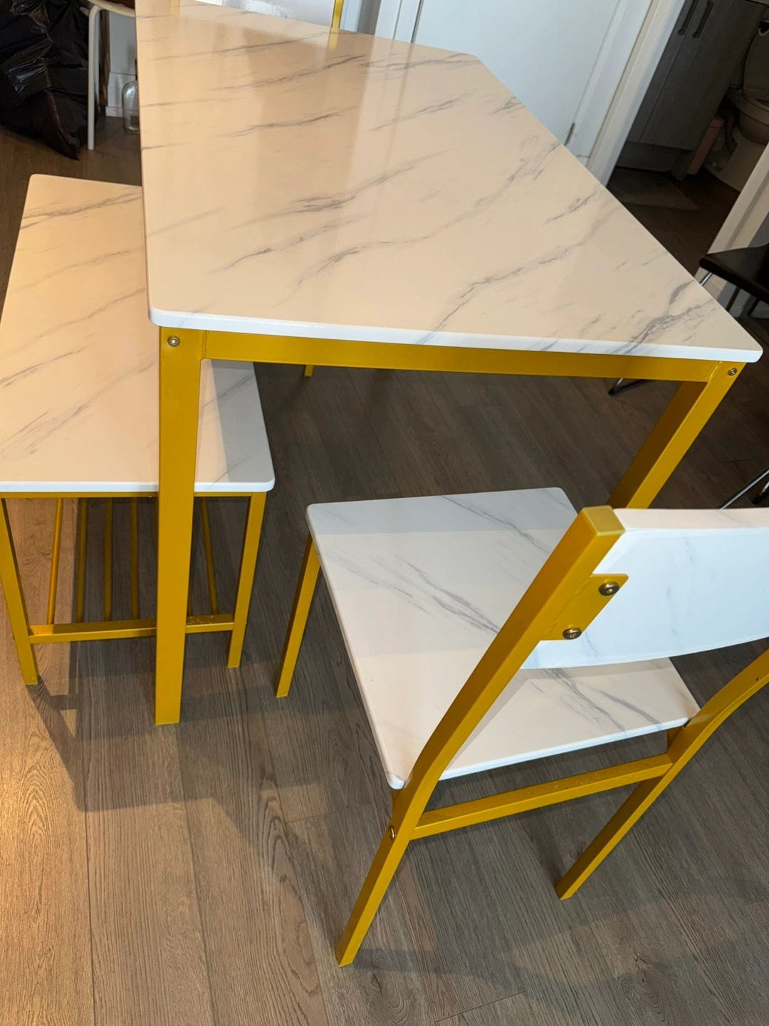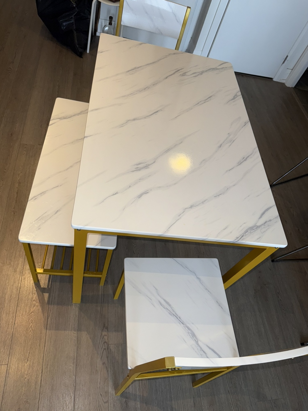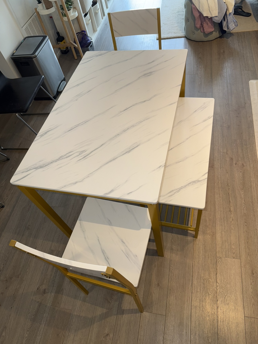 Selling a dining table set with a faux white marble top and gold frame. It includes the table, two chairs, and a bench. The set is in great condition and would look lovely in any dining space!