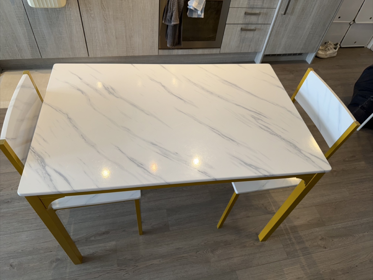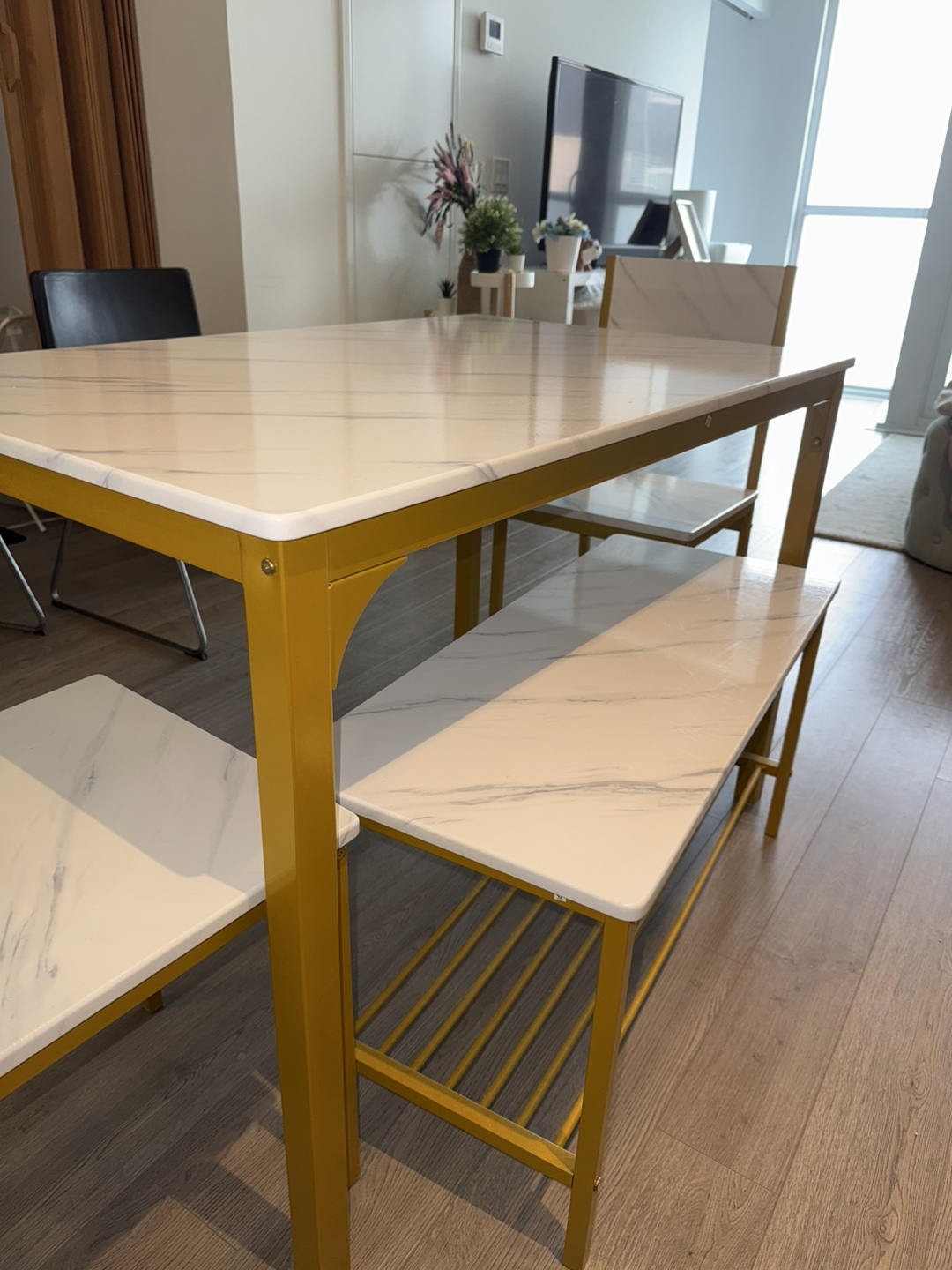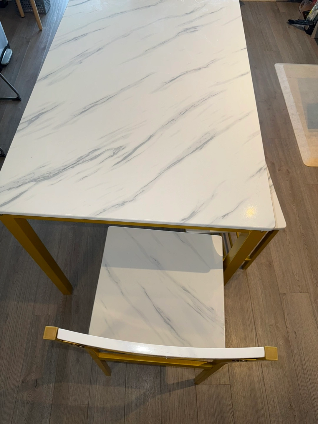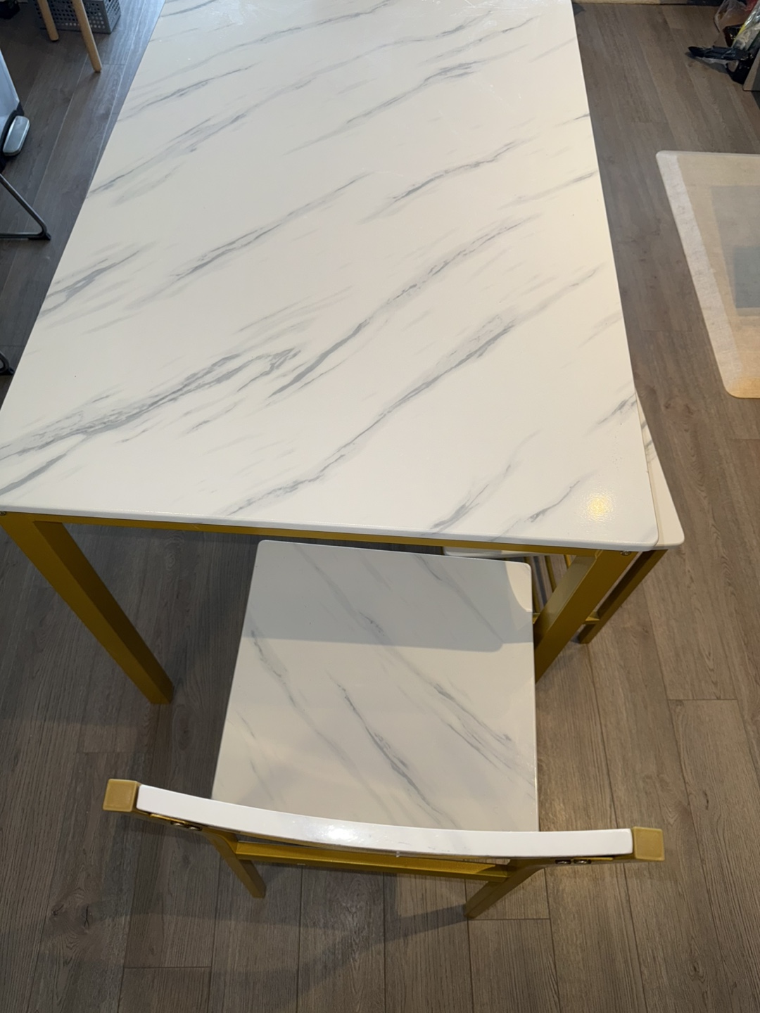 Selling a dining table set with a faux white marble top and gold frame. It includes the table, two chairs, and a bench. The set is in great condition and would look lovely in any dining space!