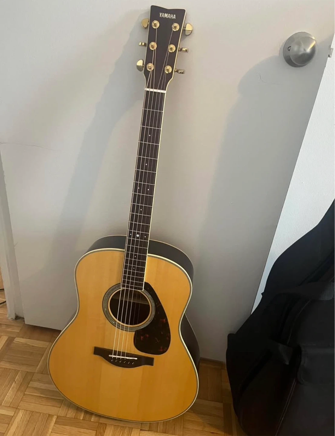 This is a Yamaha LL6 acoustic guitar. It has a spruce top and mahogany back and sides. A soft gig bag is included. Perfect for beginners and experienced players alike!