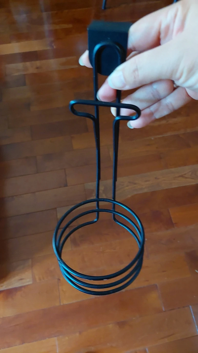 This black metal organizer rack hangs over the door for convenient storage. It features a circular base for holding items and a hook for hanging. It's a simple and sturdy solution for extra space!