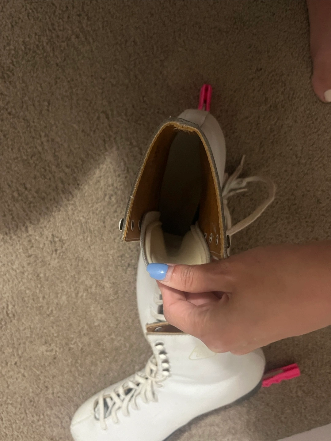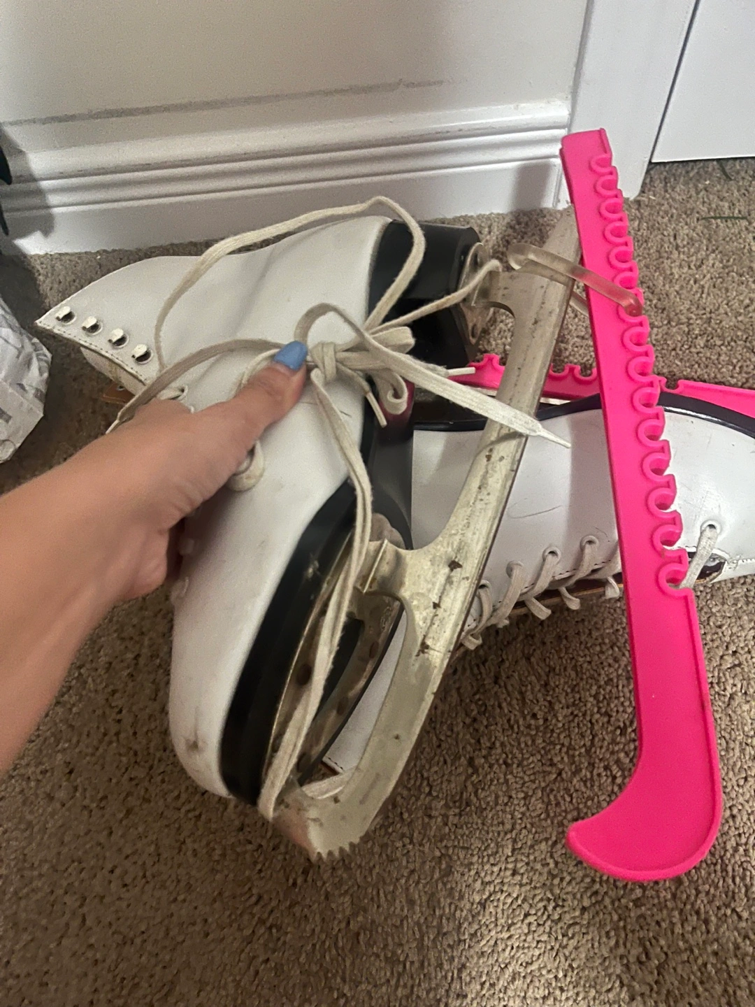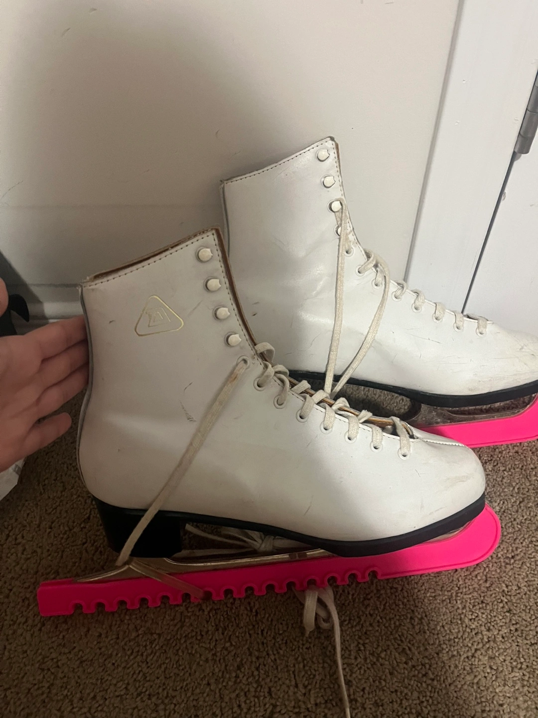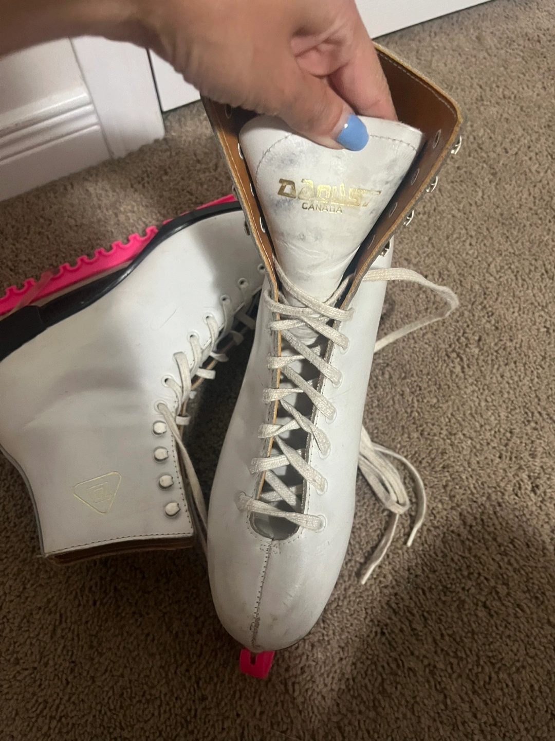 Selling a pair of Dominion Canada ice skates. They're white with pink blade guards and show some signs of wear. Perfect for recreational skating!