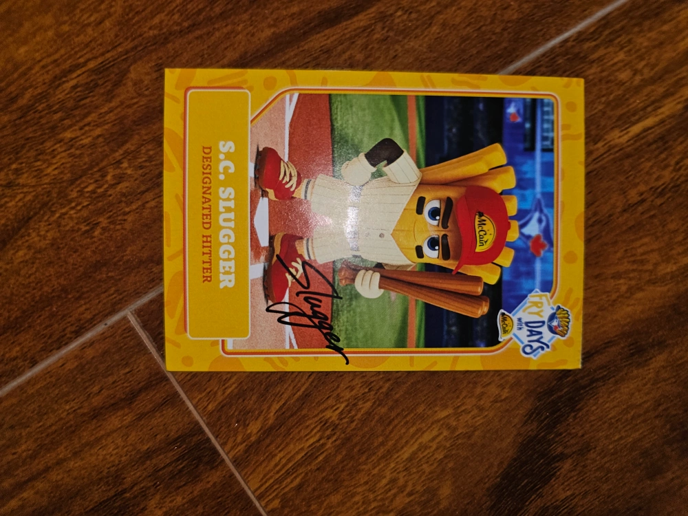 Trading a McCain S.C. Slugger trading card. It features S.C. Slugger, the Designated Hitter. His hometown is Portage la Prairie, Manitoba, and his specialty is Smashing' Taters