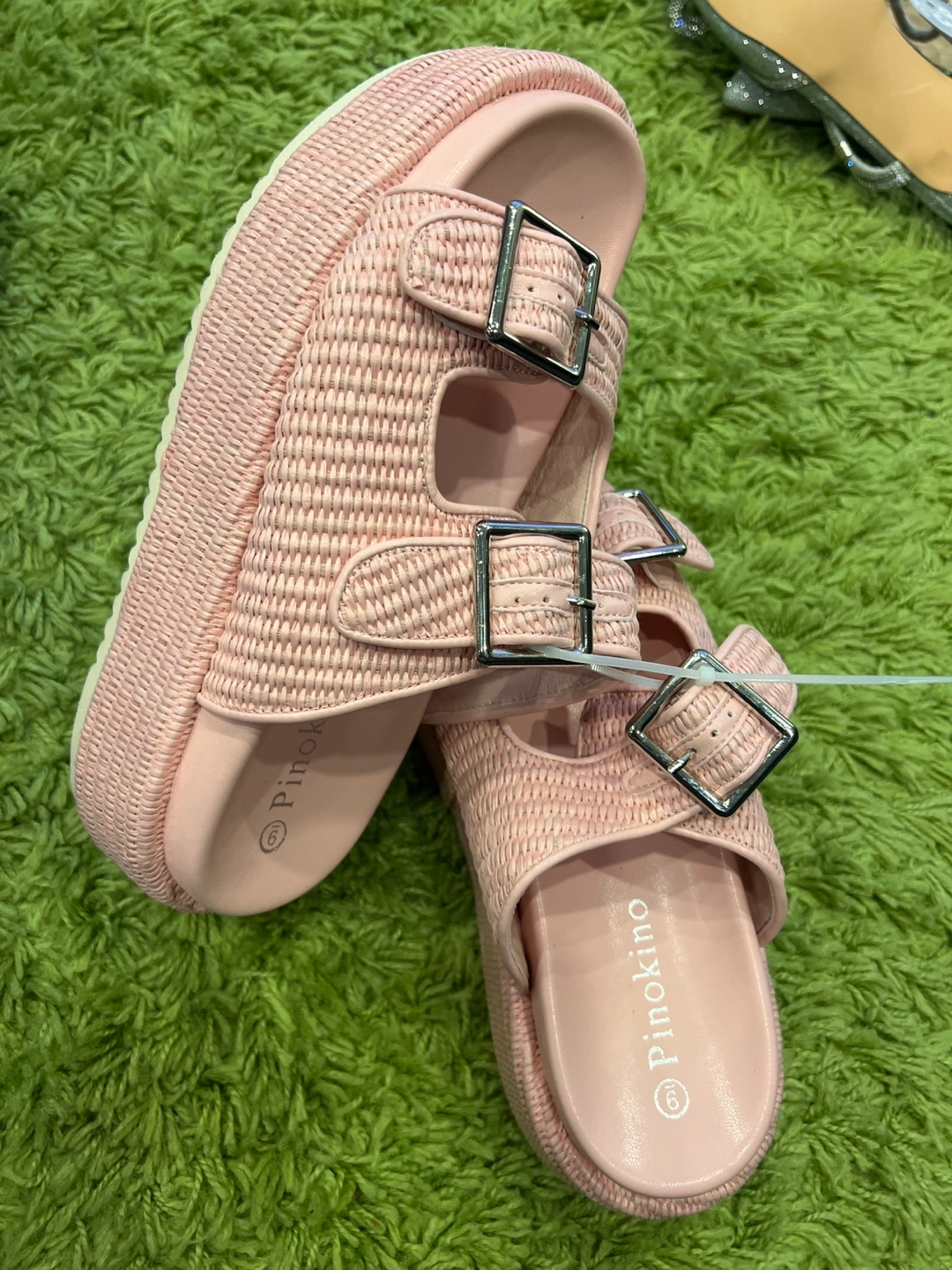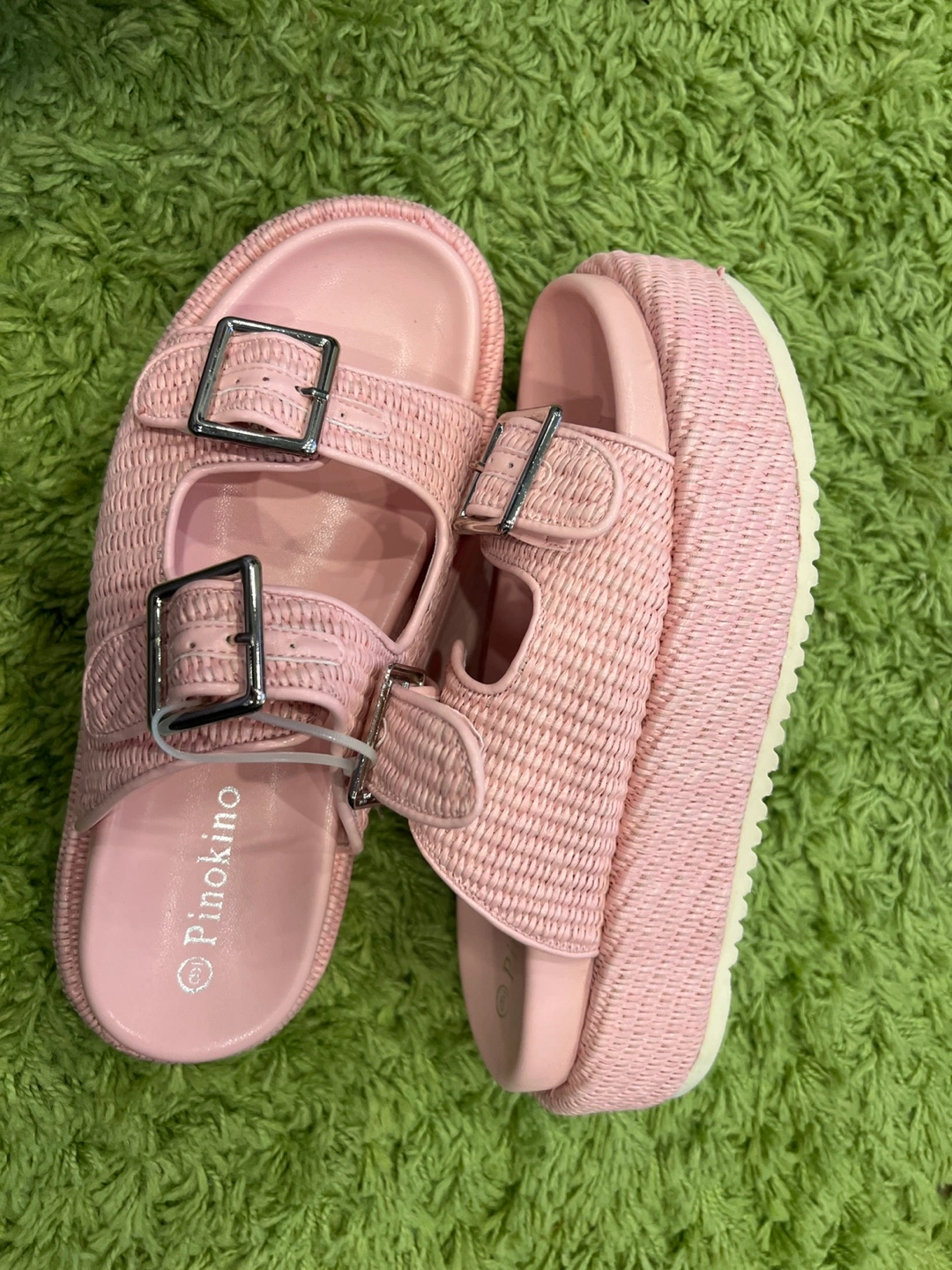New Cute Pinokino platform sandals in a lovely pink colour! They feature a double strap design with silver buckles. Perfect for adding a bit of height and style to your summer outfits