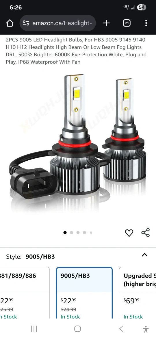203Selling a pair of 9005 LED headlight bulbs. They're designed for HB3 9005 9145 9140 H10 H12 headlights, and can be used for high beam or low beam fog lights. They feature DRL, are 500% brighter, offer 6000K eye-protection white light, and are plug and play. Plus, they're IP68 waterproof with a fan. Style: 9005/HB3
