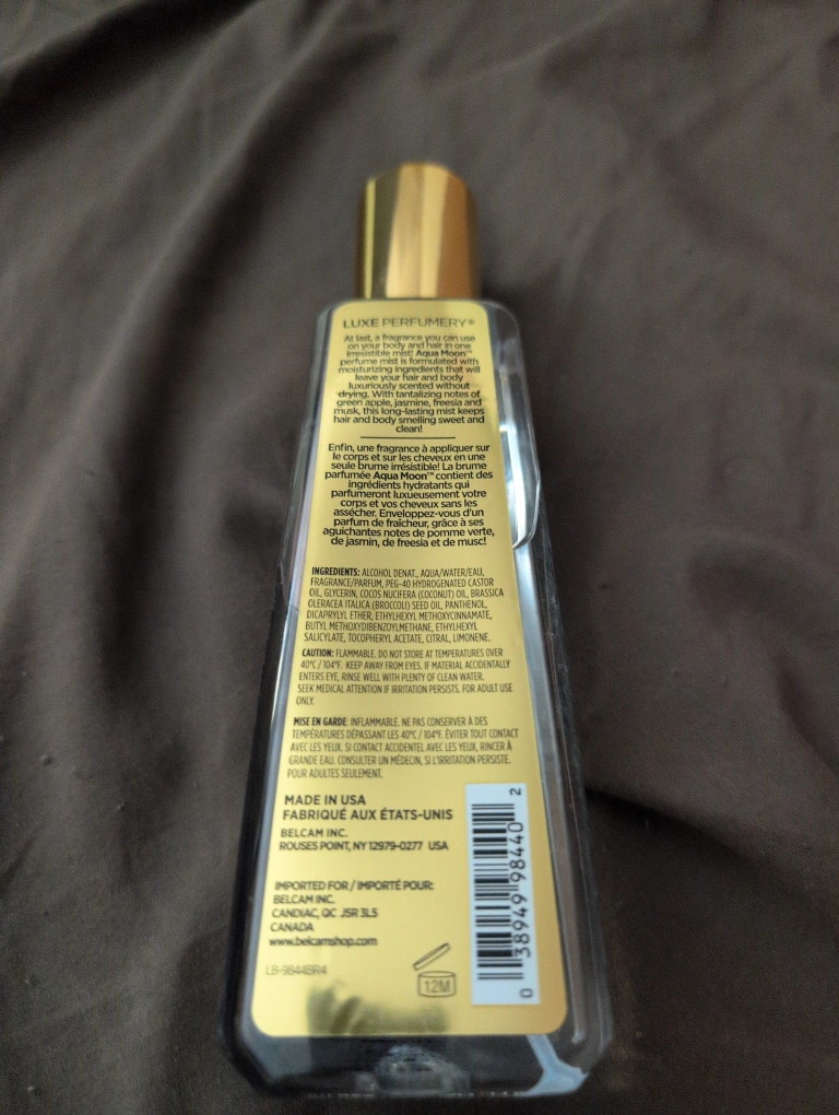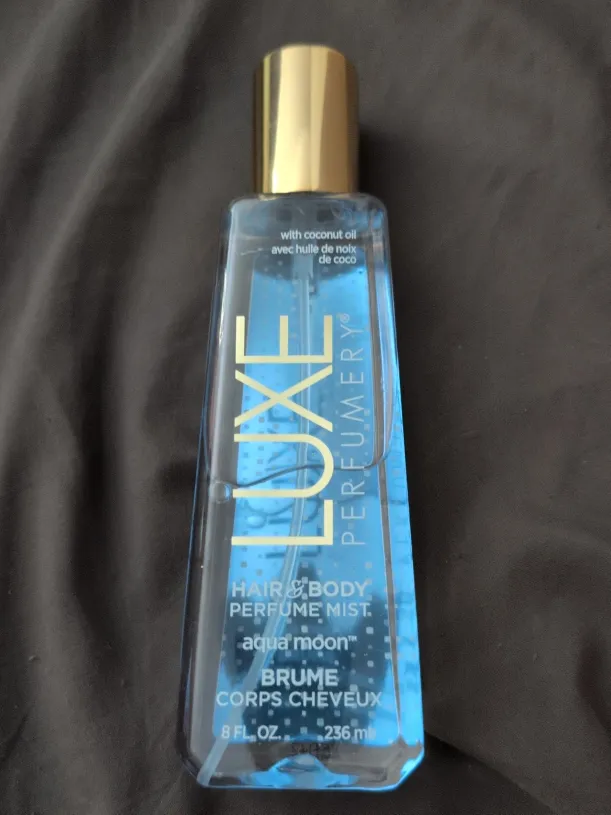 Selling a Luxe Perfumery Hair & Body Perfume Mist in the Aqua Moon scent. It's an 8 fl oz (236 ml) bottle. This mist contains coconut oil and has a lovely blend of green apple, jasmine, freesia, and musk for a sweet and clean fragrance