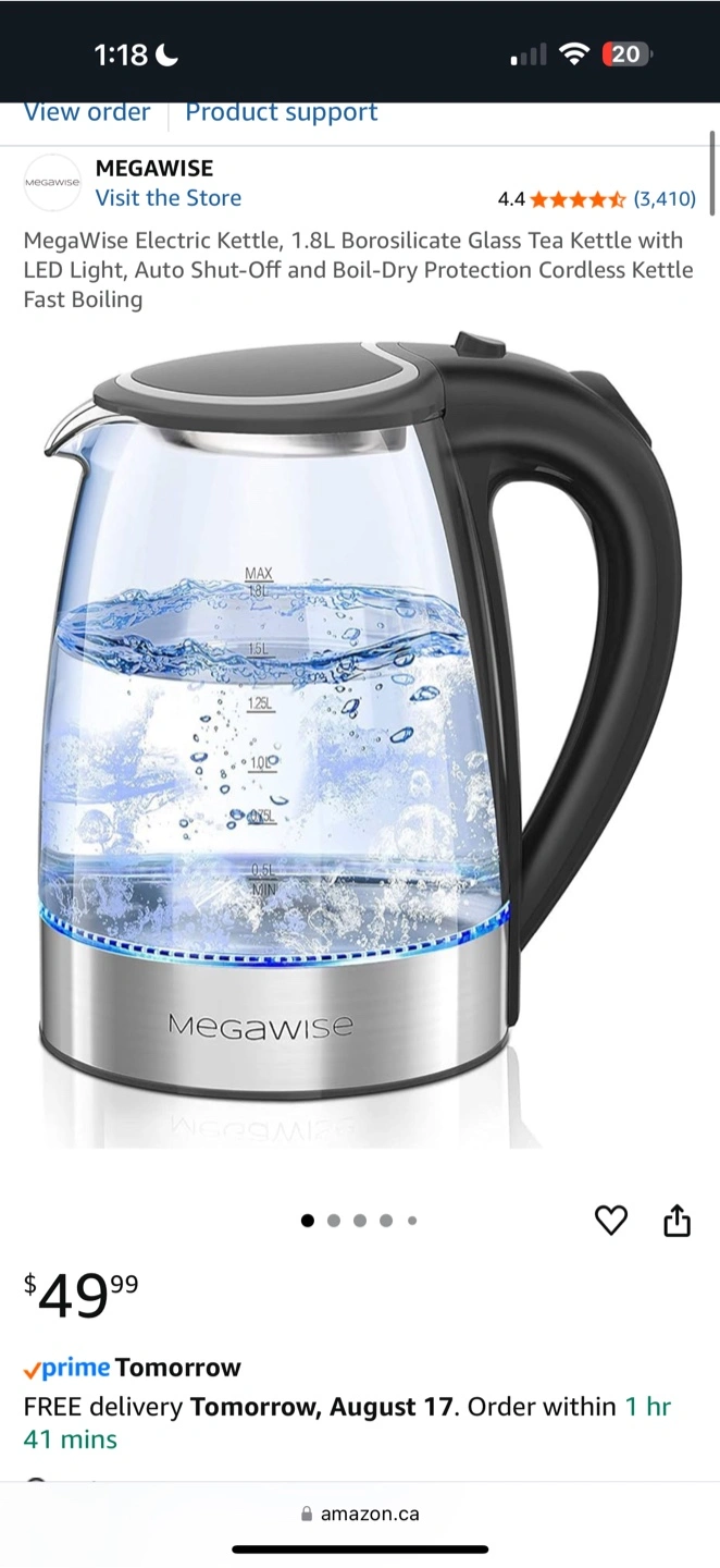 Selling a MegaWise electric kettle with a 1.8L capacity. It's made of borosilicate glass and has an LED light. Features include auto shut-off and boil-dry protection. Originally bought for $49.99!