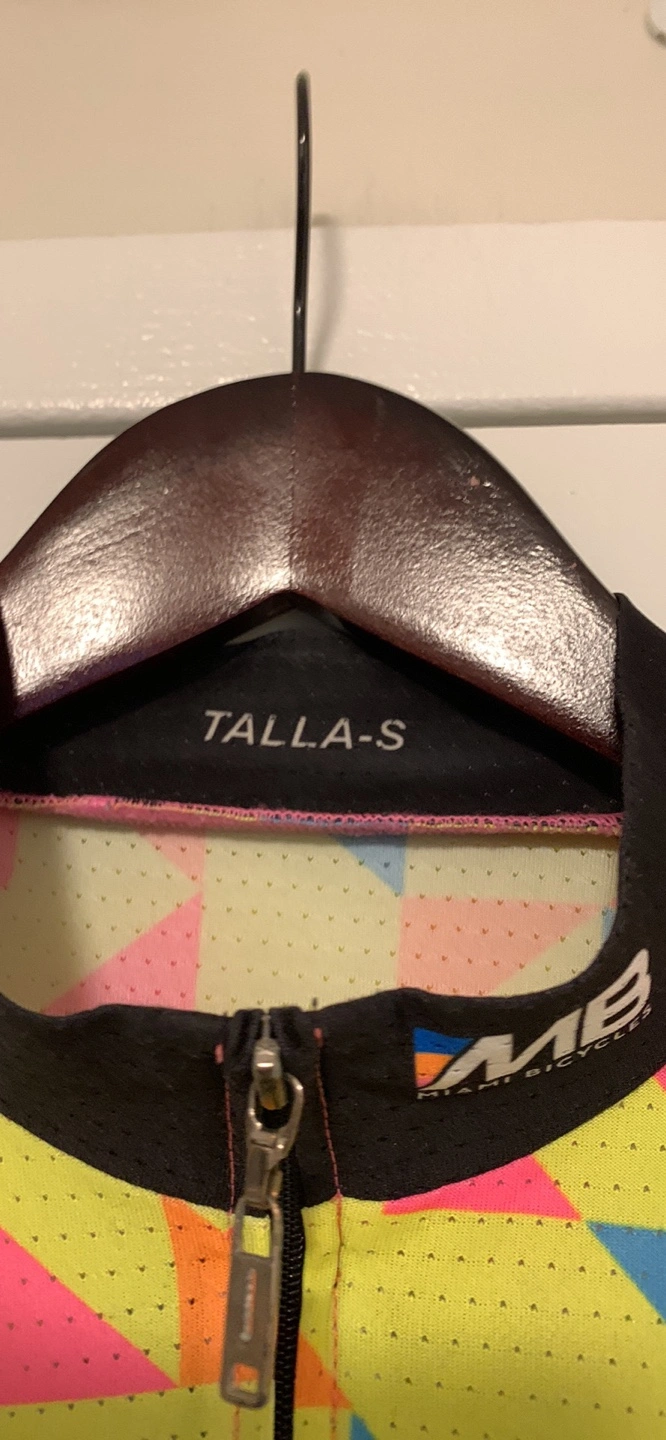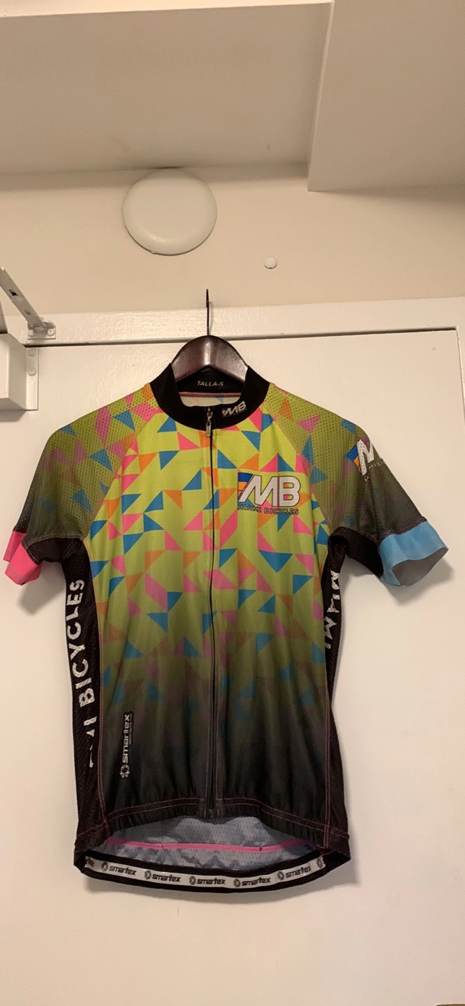 Selling a cycling jersey from Miami Bicycles! It's a size small and features a colourful geometric pattern. The jersey also has a Smartex logo. Perfect for your next ride!
