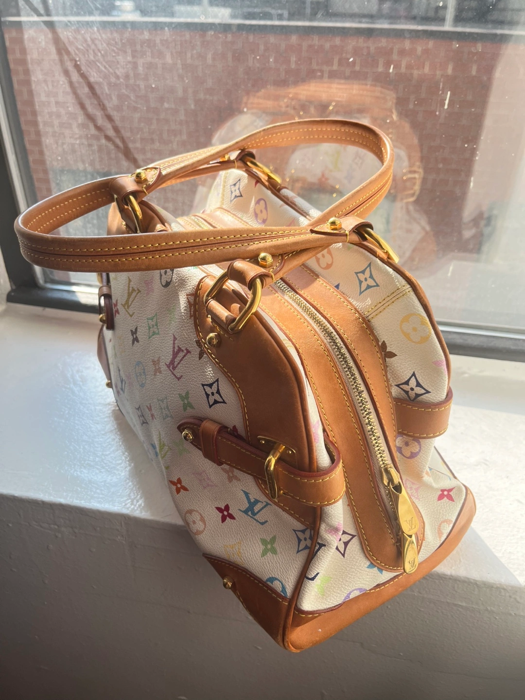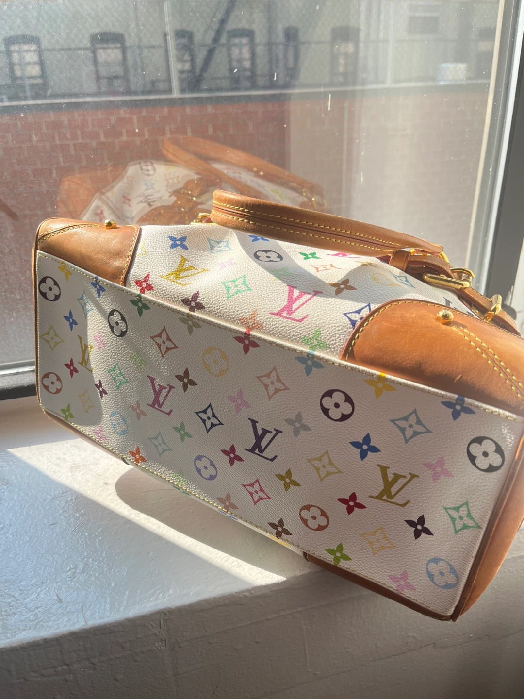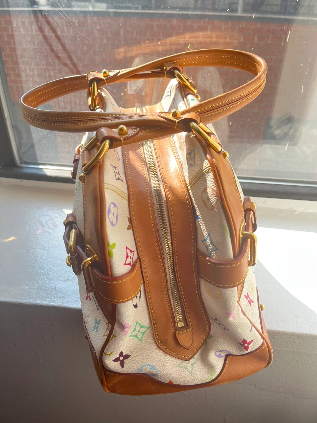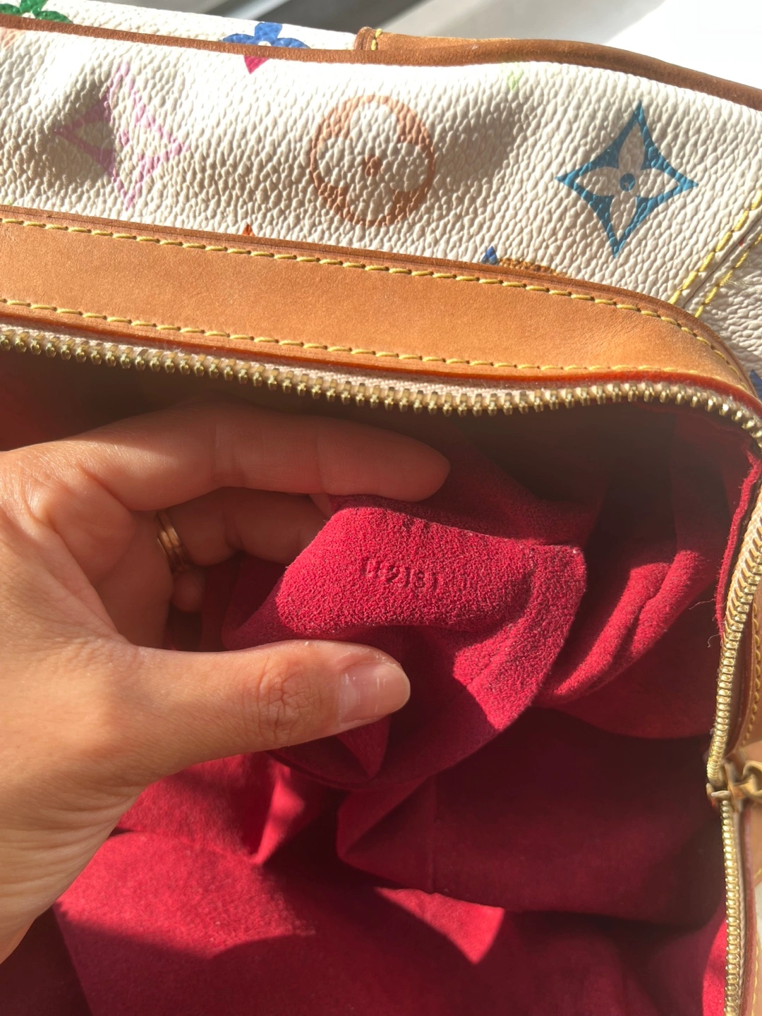Selling a Louis Vuitton by Takashi Murakami White Multicolor Claudia handbag. It's in good condition and features the iconic LV monogram in a variety of colors on white canvas, with tan leather accents. Perfect for adding a pop of color to your outfit! Description: -Louis Vuitton Shoulder Bag -From the 2008 Collection -White Coated Canvas -Multicolore Monogram Pattern -Brass Hardware -Dual Shoulder Straps -Leather Trim Embellishment -Alcántara Lining & Dual Interior Pockets -Zip Closure at Top Estimated item measurements: -Shoulder Strap Drop: 8" -Height: 9" -Width: 13.75" -Depth: 6.75" It is big enough to fit a big wallet a small tablet/e-reader/book and a pencil case, glasses case or small water bottle. It comes with pockets to keep your keys or other items organized. You can see the legitimacy code stamped in one of the pictures. *Zoom in to see the details and text me if you want/need more pictures.