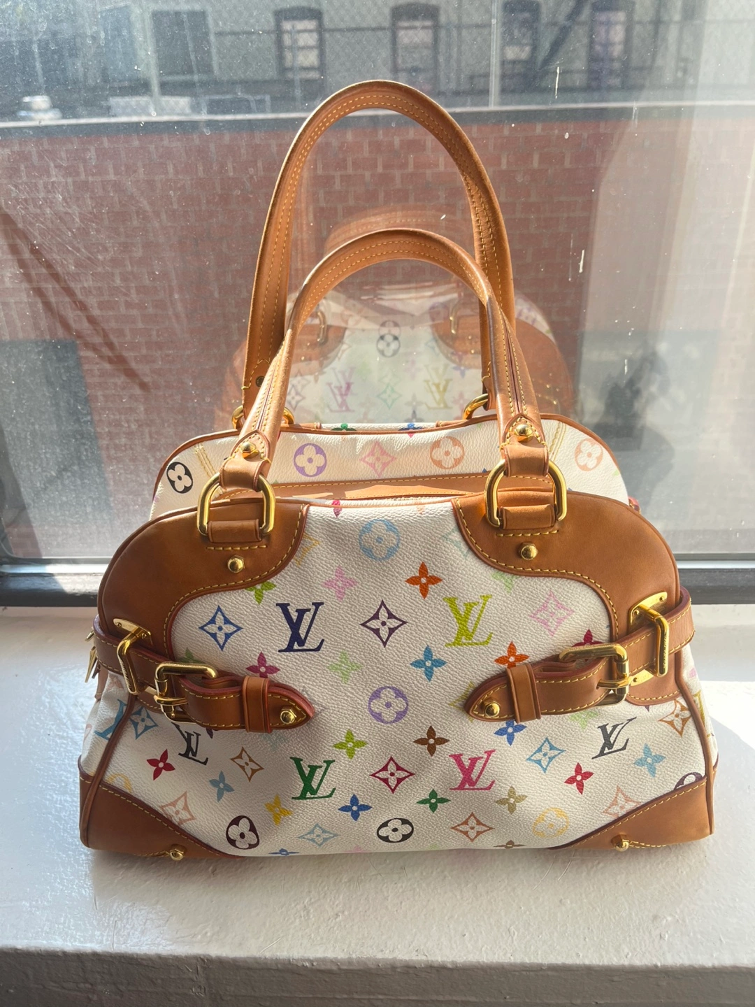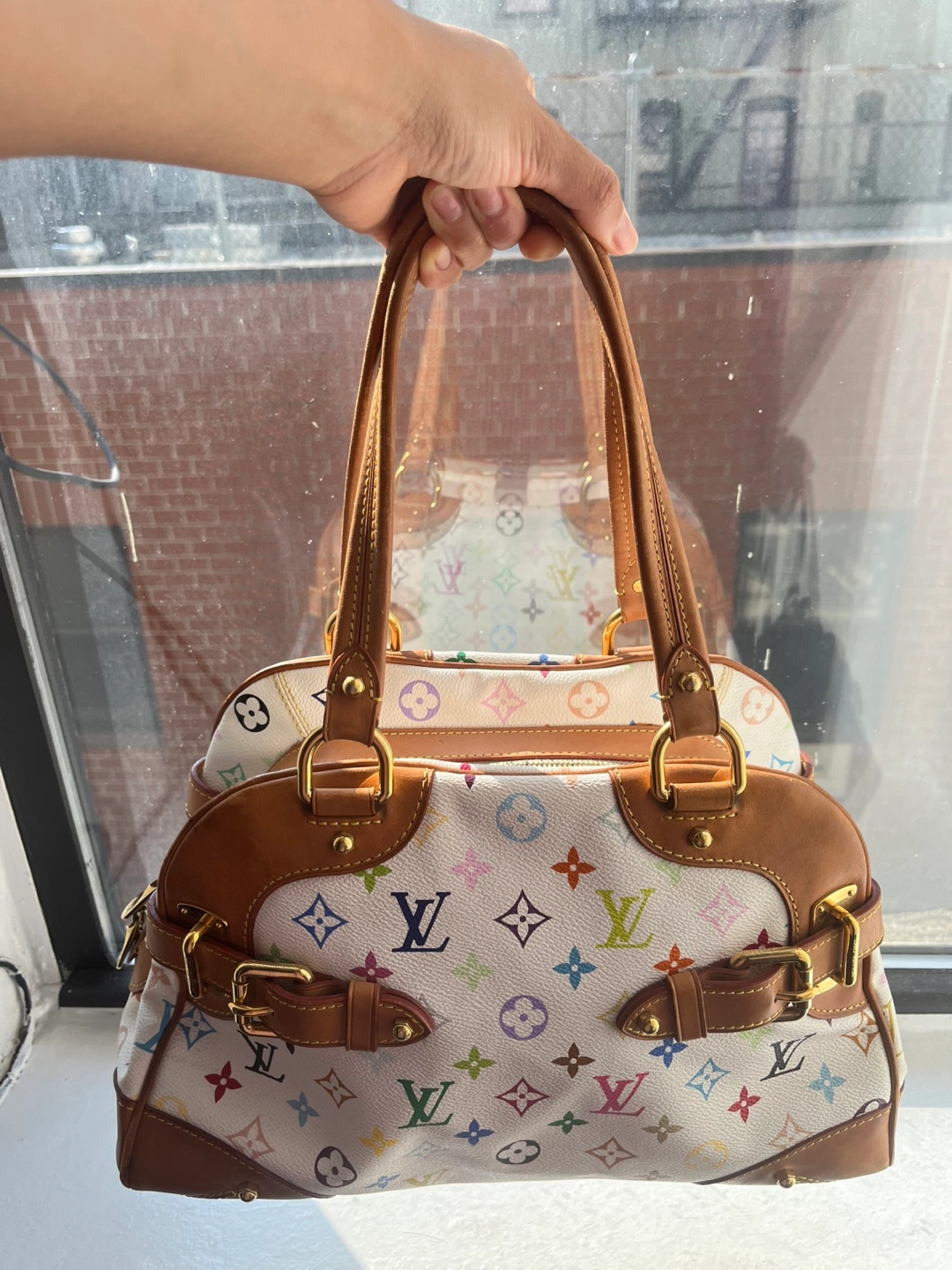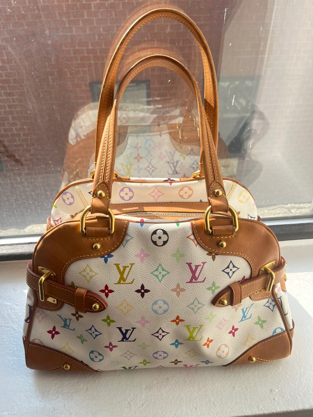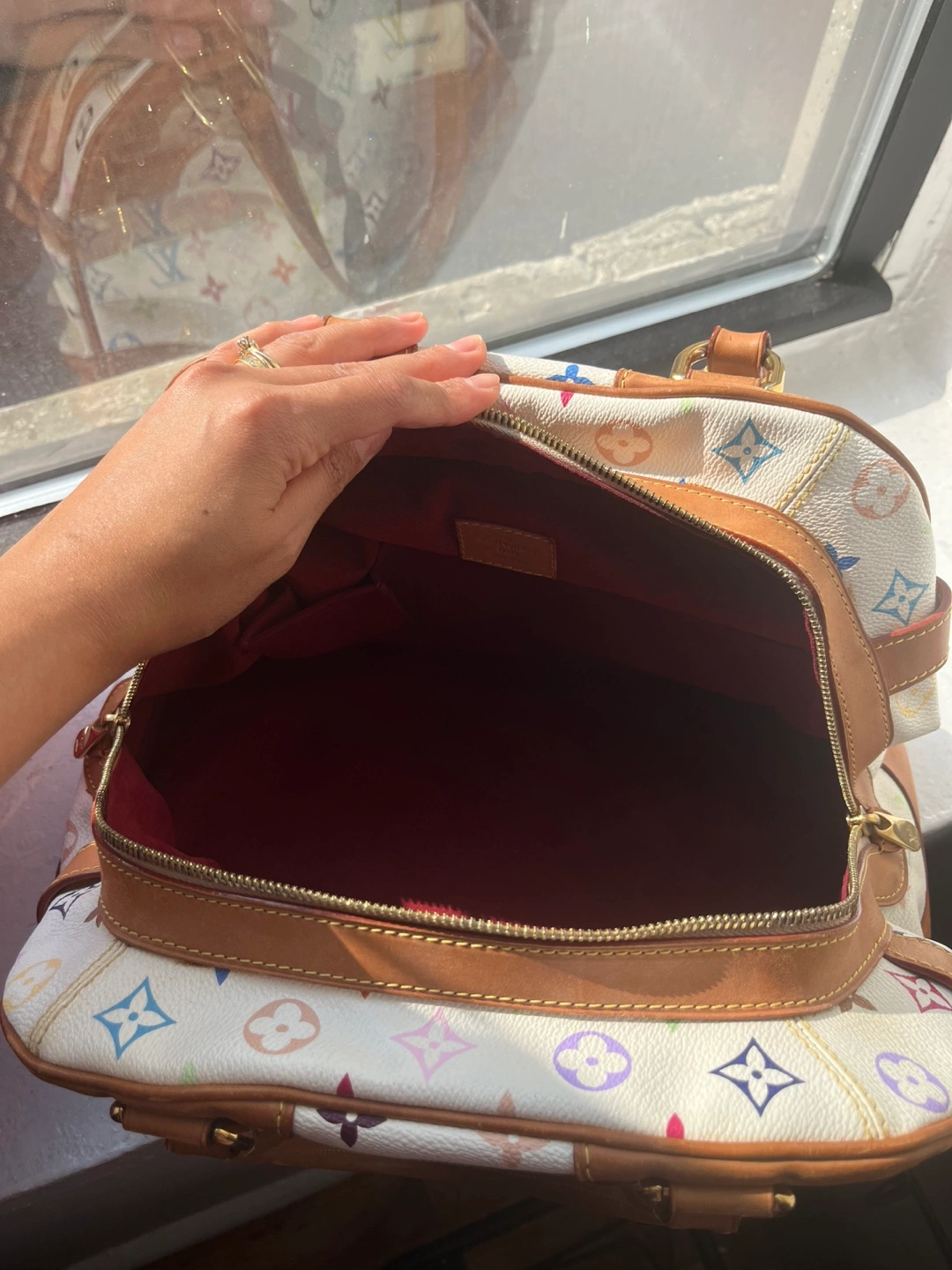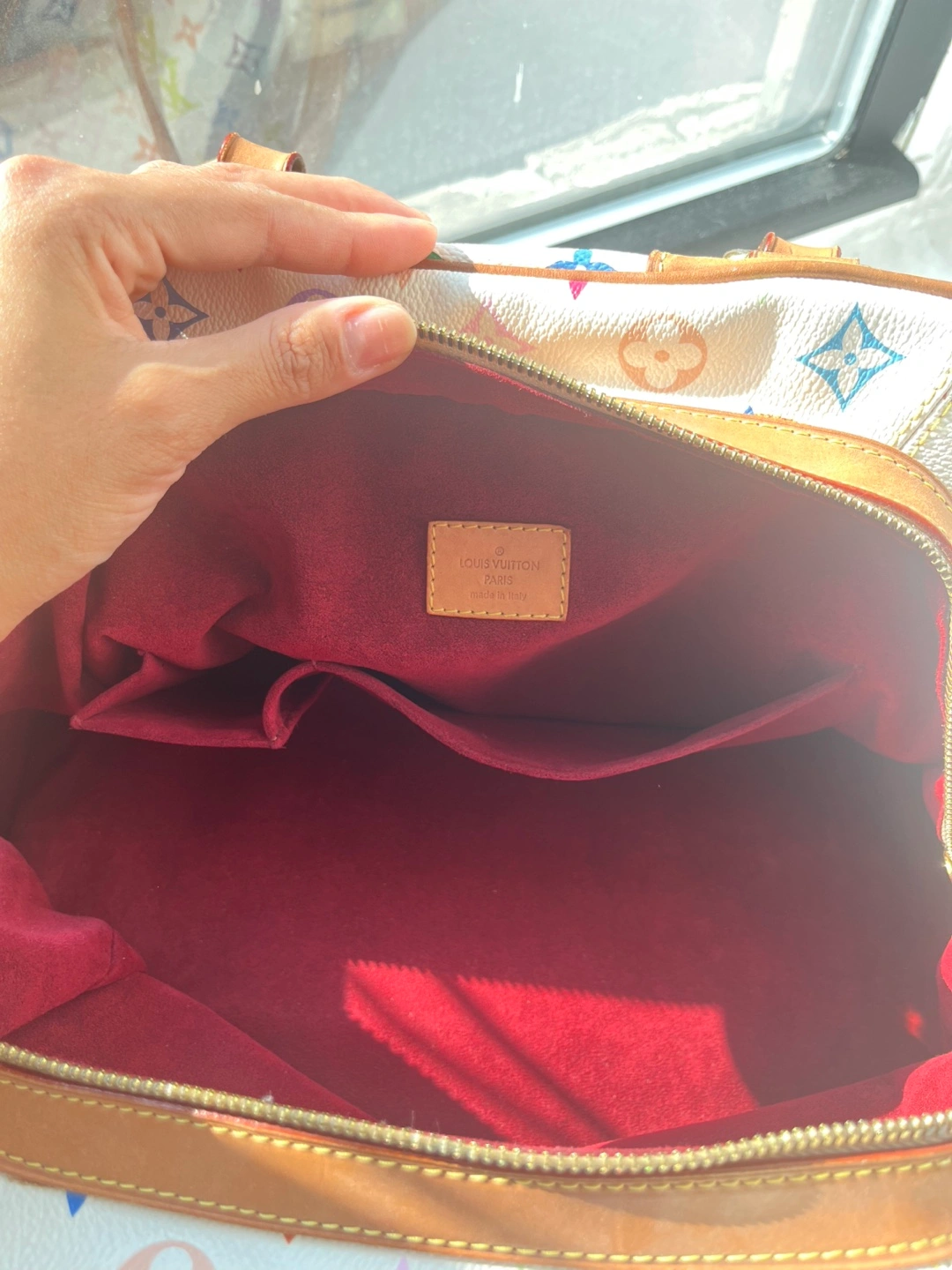 Selling a Louis Vuitton by Takashi Murakami White Multicolor Claudia handbag. It's in good condition and features the iconic LV monogram in a variety of colors on white canvas, with tan leather accents. Perfect for adding a pop of color to your outfit! Description: -Louis Vuitton Shoulder Bag -From the 2008 Collection -White Coated Canvas -Multicolore Monogram Pattern -Brass Hardware -Dual Shoulder Straps -Leather Trim Embellishment -Alcántara Lining & Dual Interior Pockets -Zip Closure at Top Estimated item measurements: -Shoulder Strap Drop: 8" -Height: 9" -Width: 13.75" -Depth: 6.75" It is big enough to fit a big wallet a small tablet/e-reader/book and a pencil case, glasses case or small water bottle. It comes with pockets to keep your keys or other items organized. You can see the legitimacy code stamped in one of the pictures. *Zoom in to see the details and text me if you want/need more pictures.