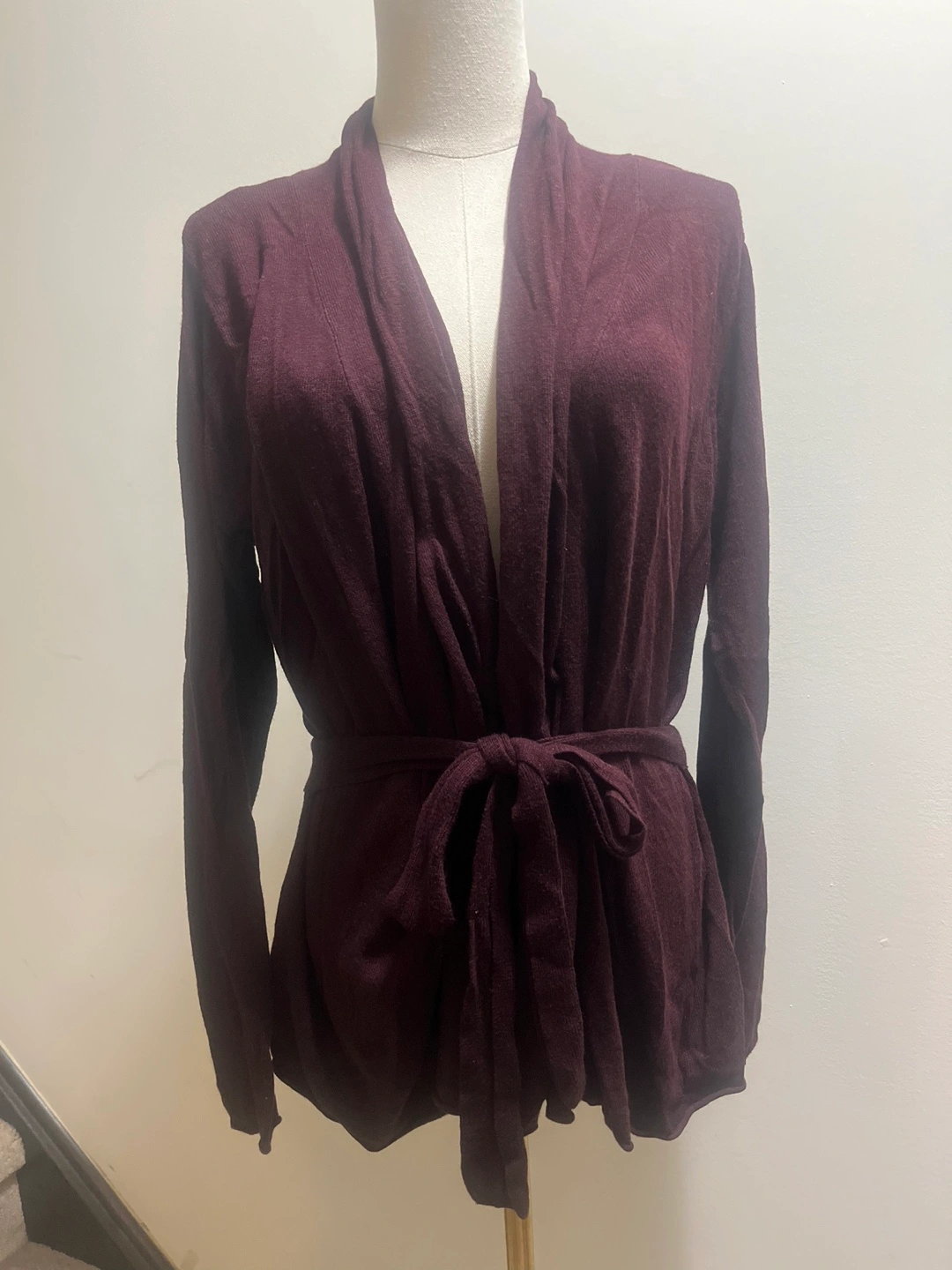 Elegant burgundy cardigan with open front and tie. Ideal for layering.