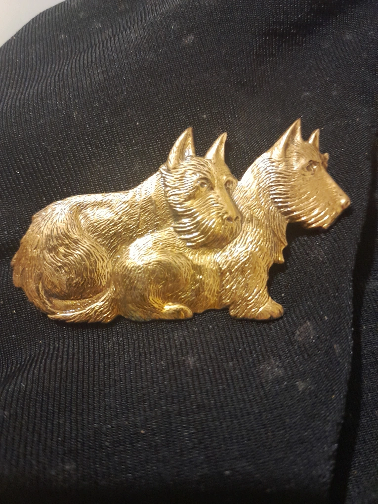 Vintage gold tone brooch featuring two Scottish Terrier dogs. It's in good condition and ready to add a touch of vintage charm to your outfit