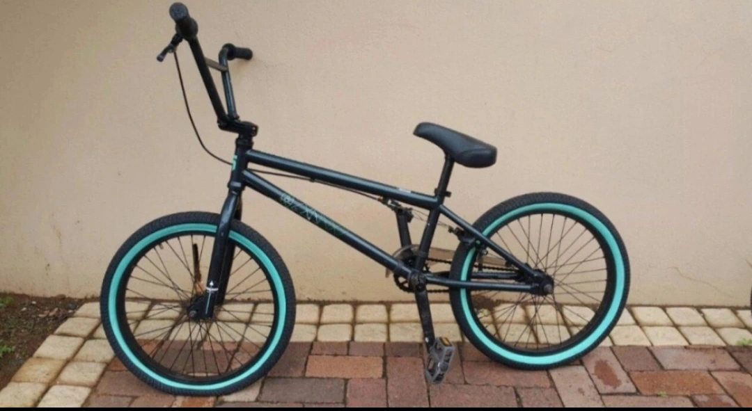 Selling a black BMX bike that's in good condition. It has teal rims that add a nice pop of color. Perfect for anyone looking to get into BMX or needs a reliable bike for tricks and stunts!