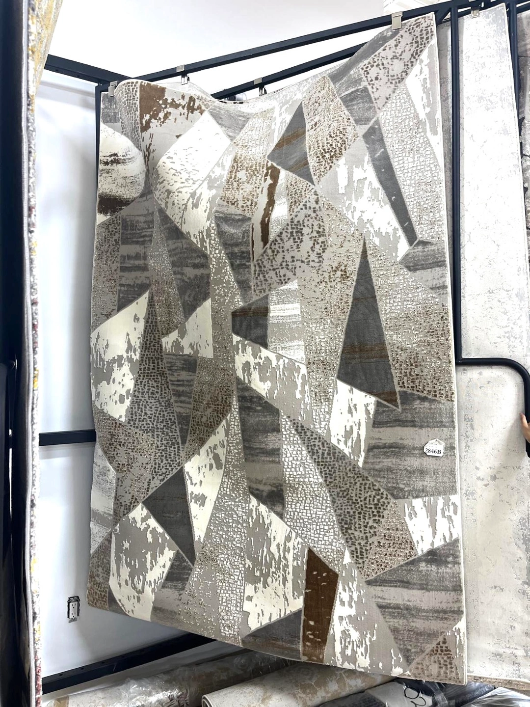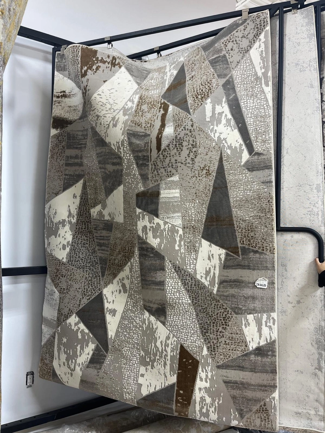 Here's a stylish area rug with an abstract geometric pattern in neutral tones. It would look great in any living space or bedroom