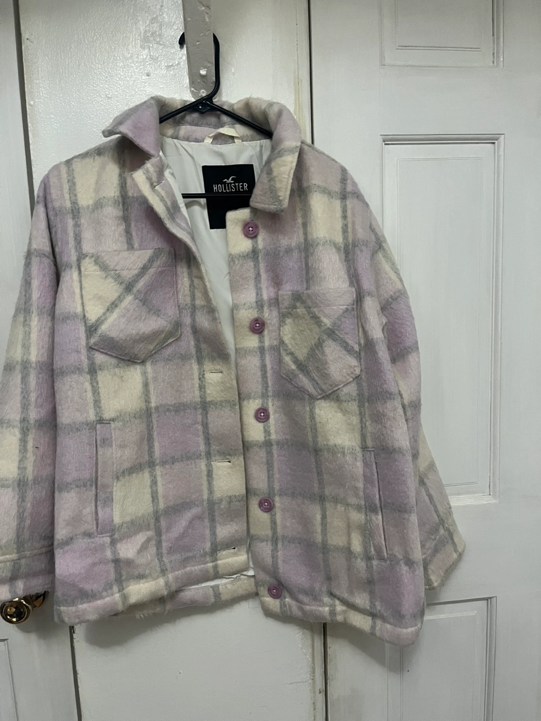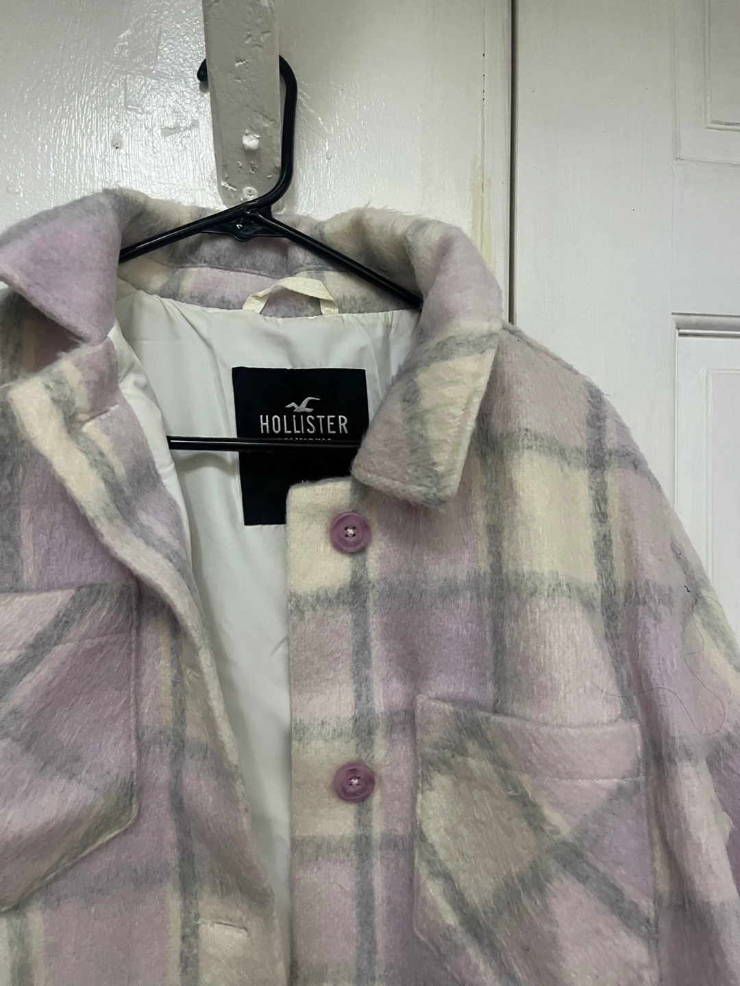 Selling a cute Hollister plaid shacket! It's a stylish blend of a shirt and jacket, perfect for layering. The colors are a soft purple and white in a classic plaid pattern. Great for adding a touch of casual style to any outfit
