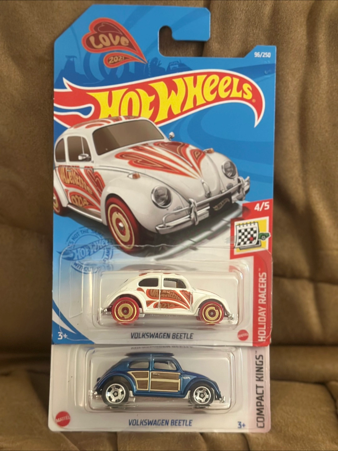 Selling two Hot Wheels Volkswagen Beetle diecast cars. They are new in the package. One is a blue Compact Kings edition and the other is a white Holiday Racers edition