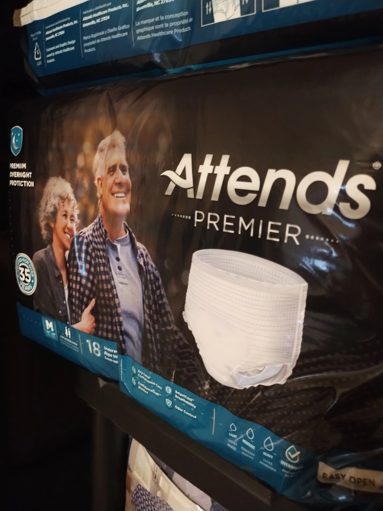 Selling 12 packs of Attends Premier Underwear. Size is Medium, and there are 18 in the pack. Provides premium overnight protection.