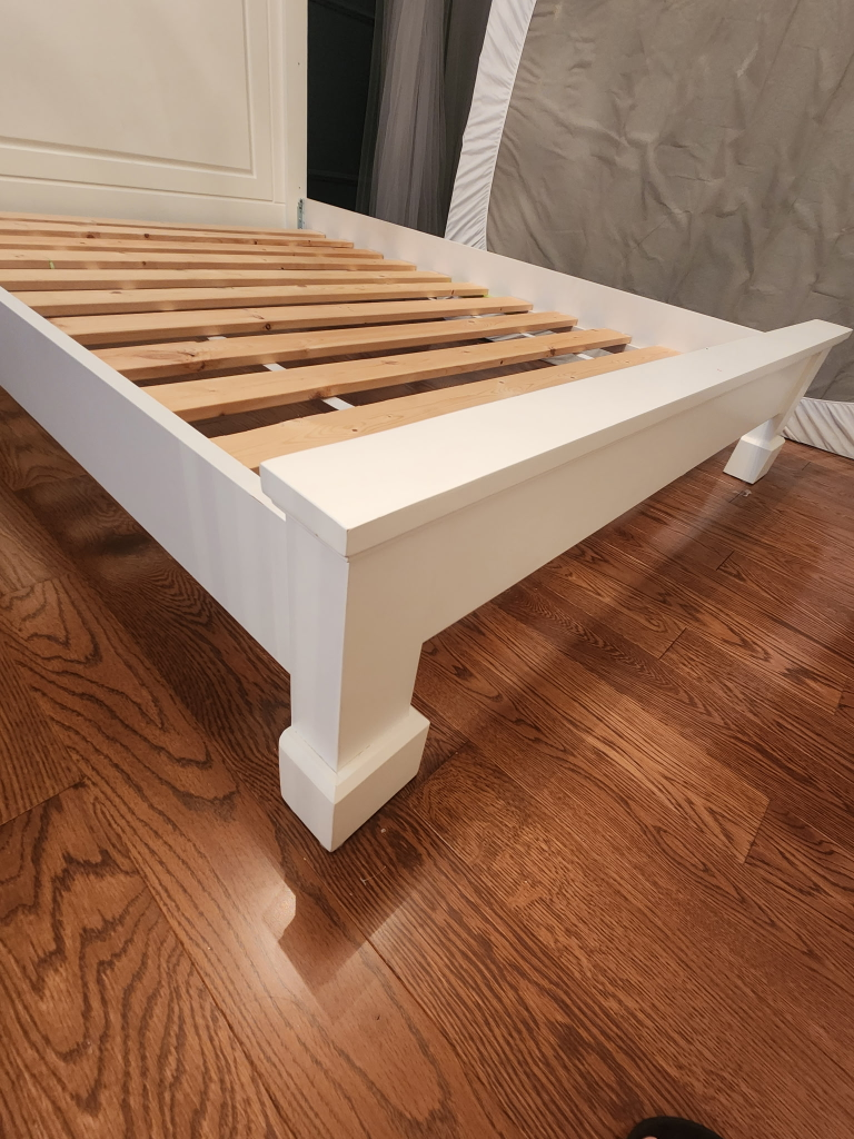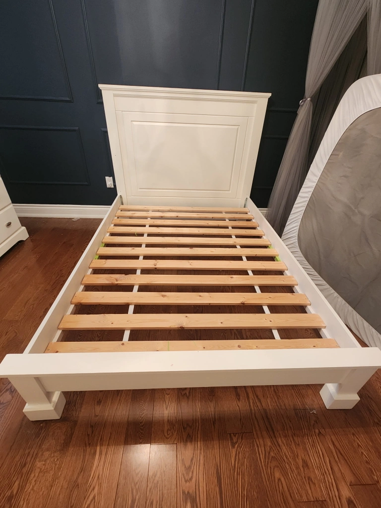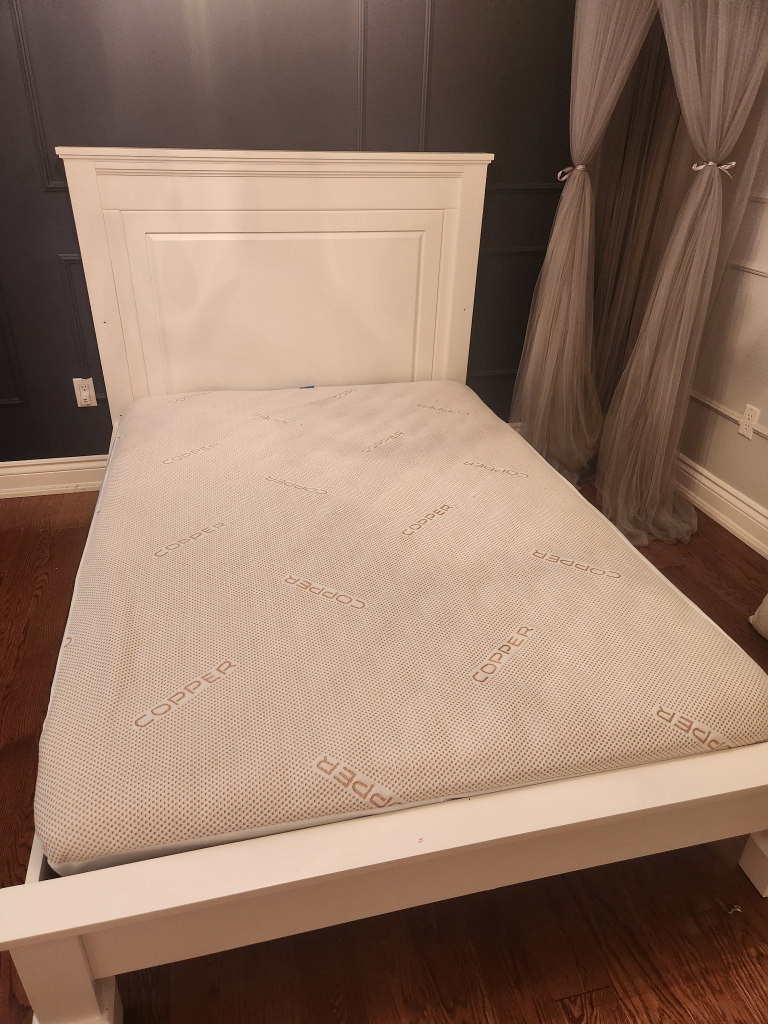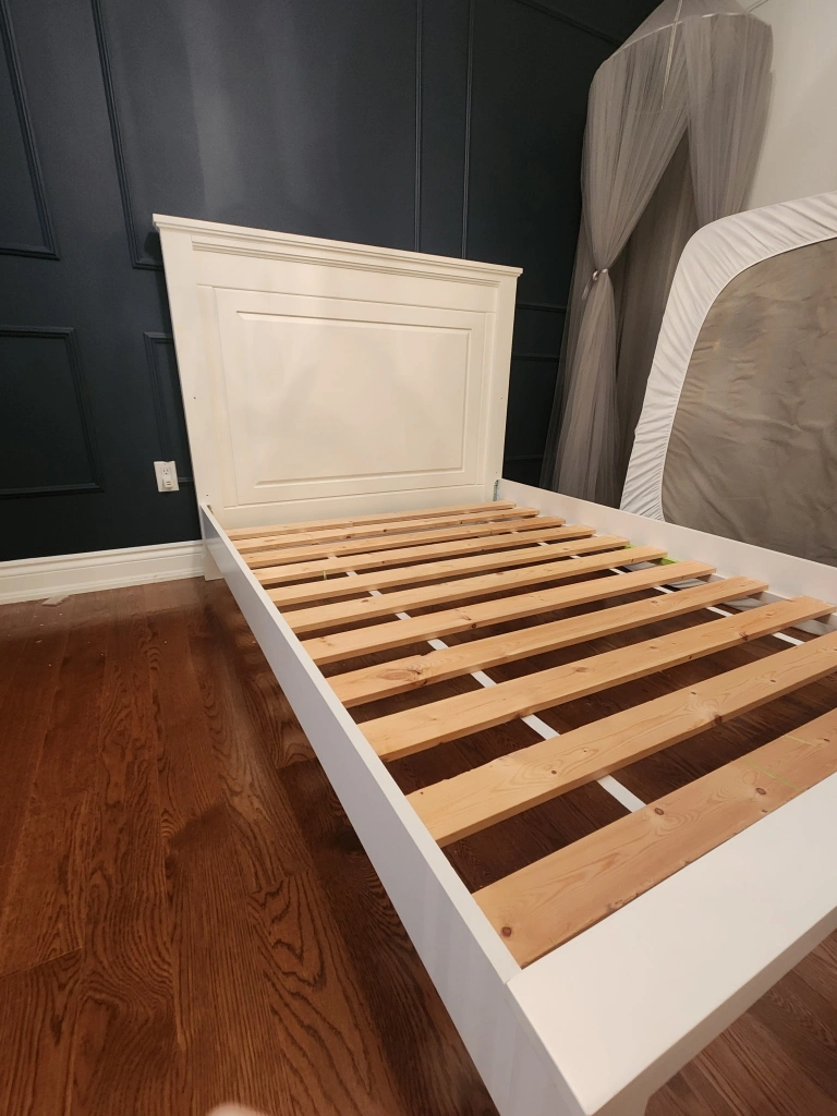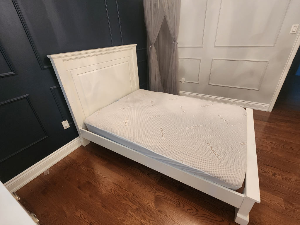 Crib that turns into double bed. No box spring needed. Excellent condition. Purchased from Direct Interiors, Canadian made, real wood. Crib mattress included. Double Mattress not included. Pick up only. (Disassembled)