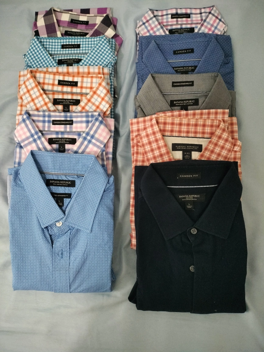 Selling a collection of Banana Republic men's dress shirts, all size Large! These shirts are in great condition and feature a variety of styles, including Camden Fit and Standard Fit. Perfect for work or a night out. 10 for $20.