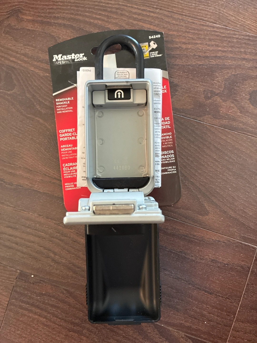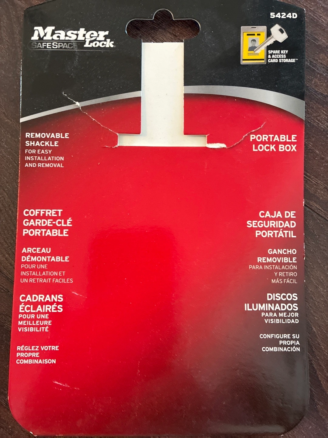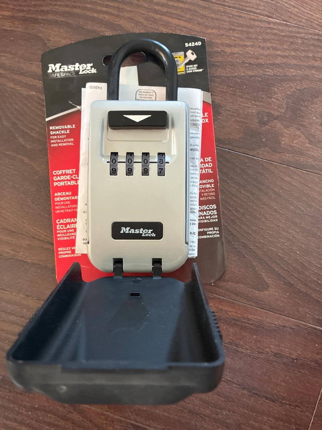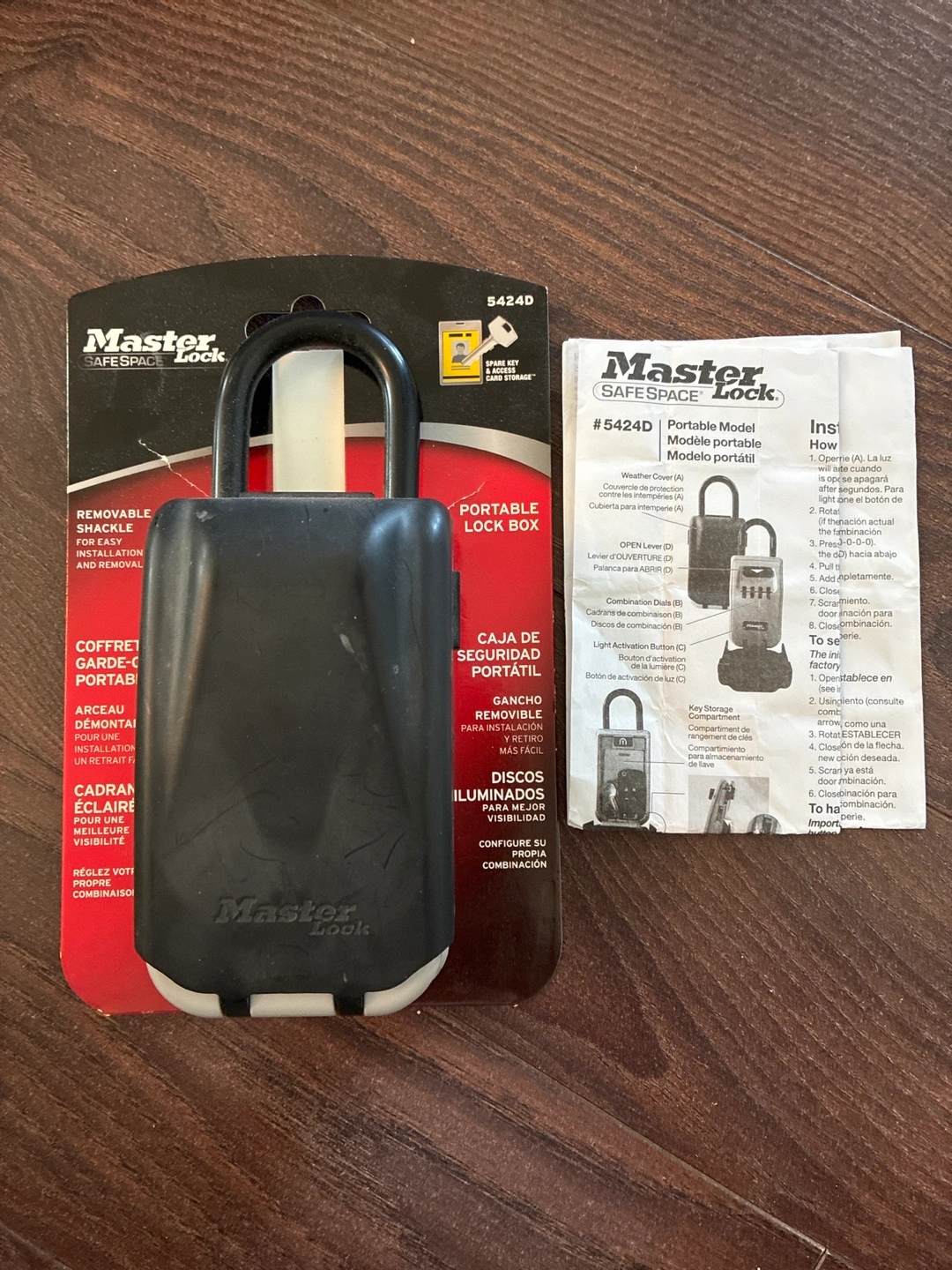 Selling a Master Lock SafeSpace portable lock box, model 5424D. It comes with a removable shackle for easy installation and removal. The lock box features light-up dials for better visibility and allows you to set your own combination. It also includes the original packaging and instructions