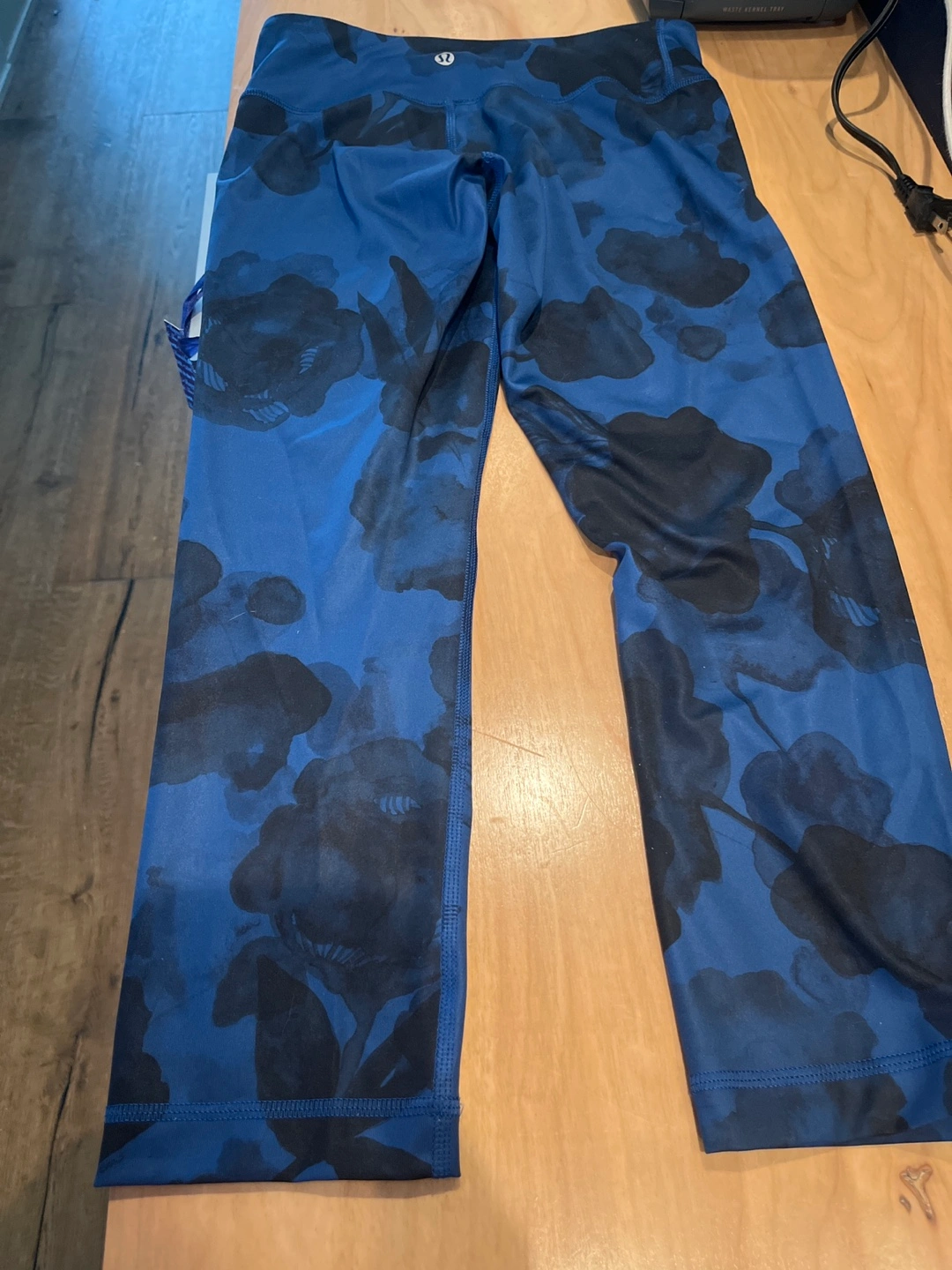 Selling a pair of Lululemon capri leggings in size 4. They're a lovely blue colour with a floral pattern. Perfect for workouts or just lounging around! Super soft material.