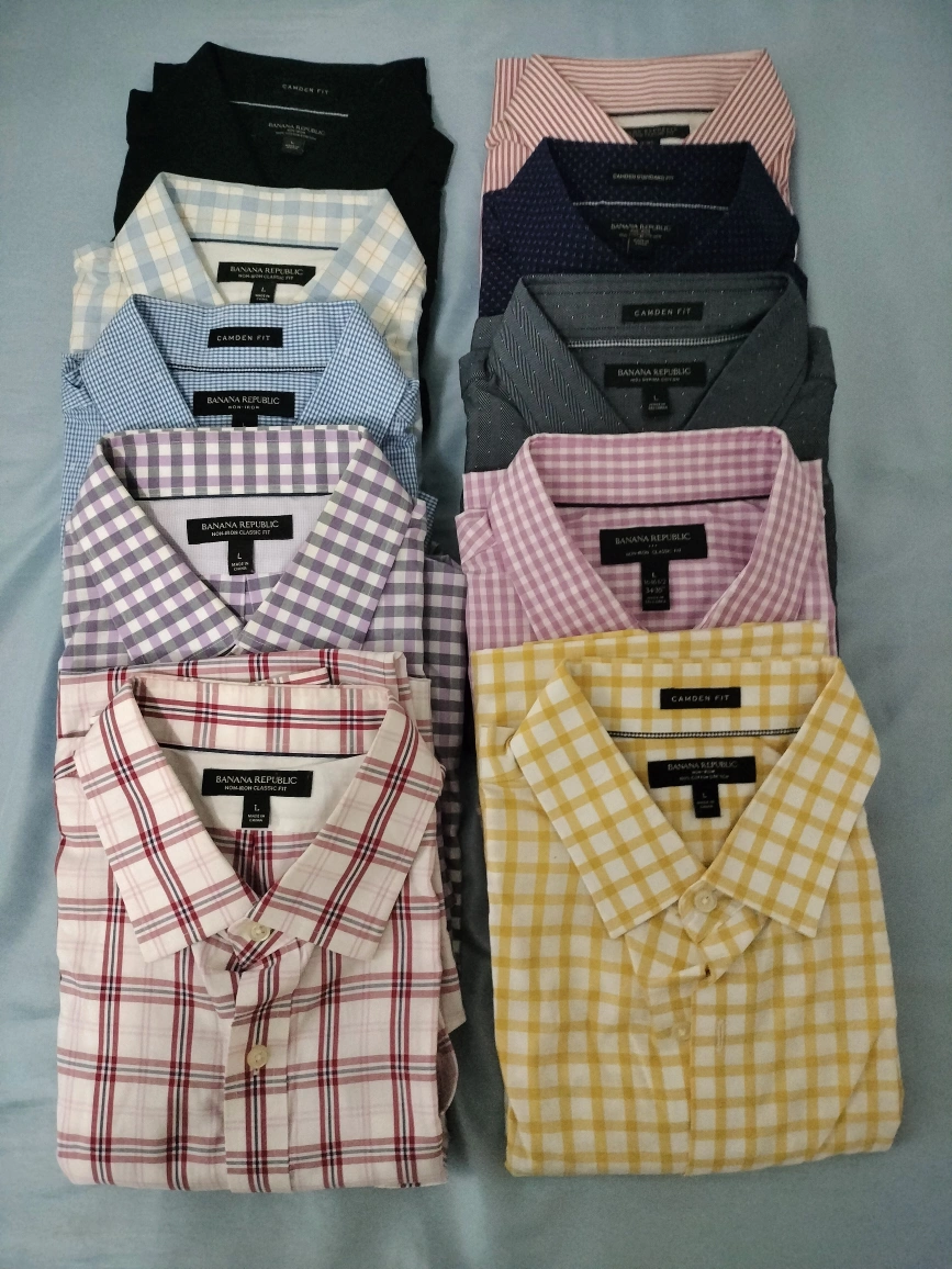 I'm selling a bundle of Banana Republic dress shirts in size Large. These shirts come in various colors and patterns. They are in great condition and ready for a new home! 10 for $20