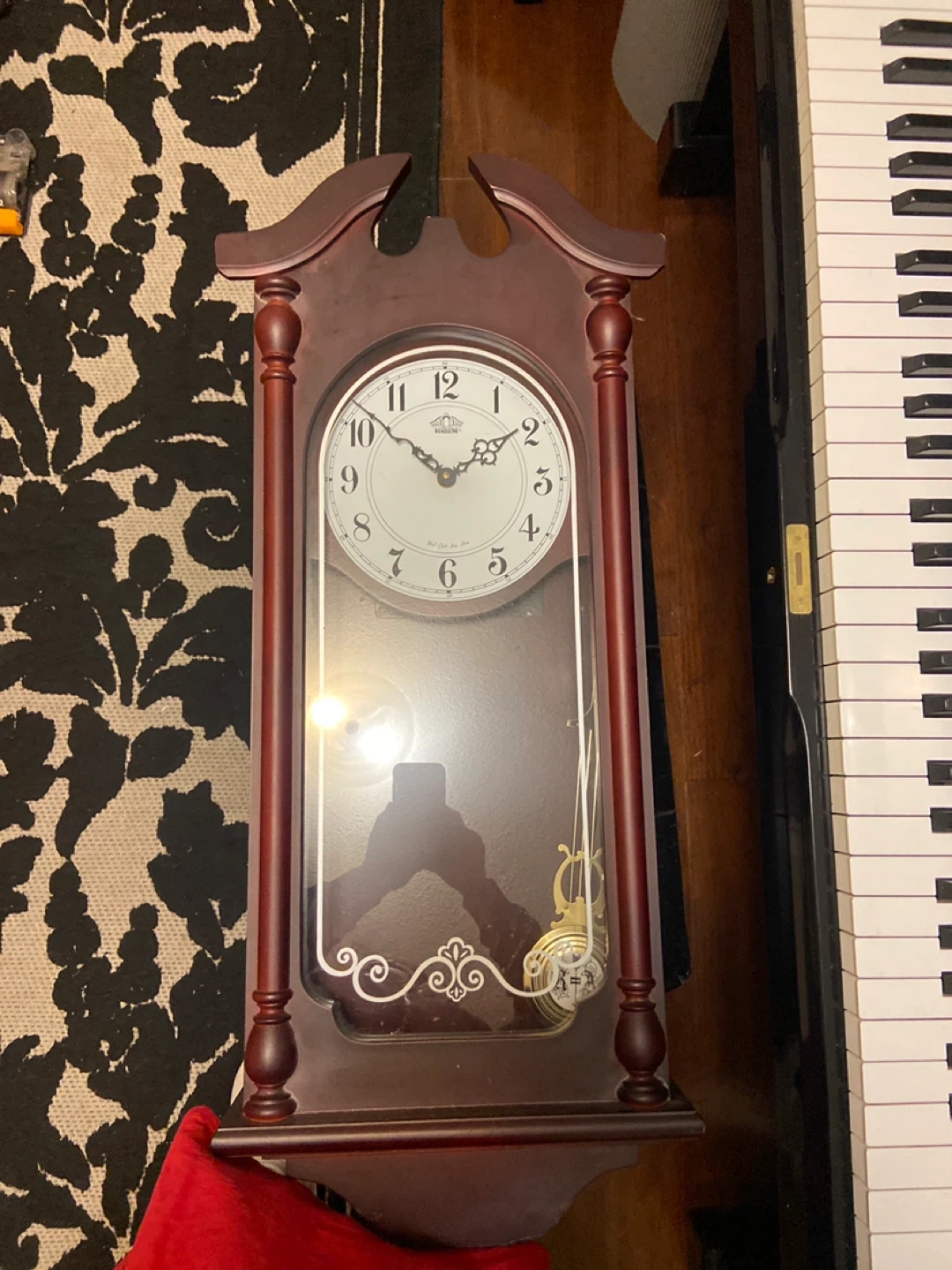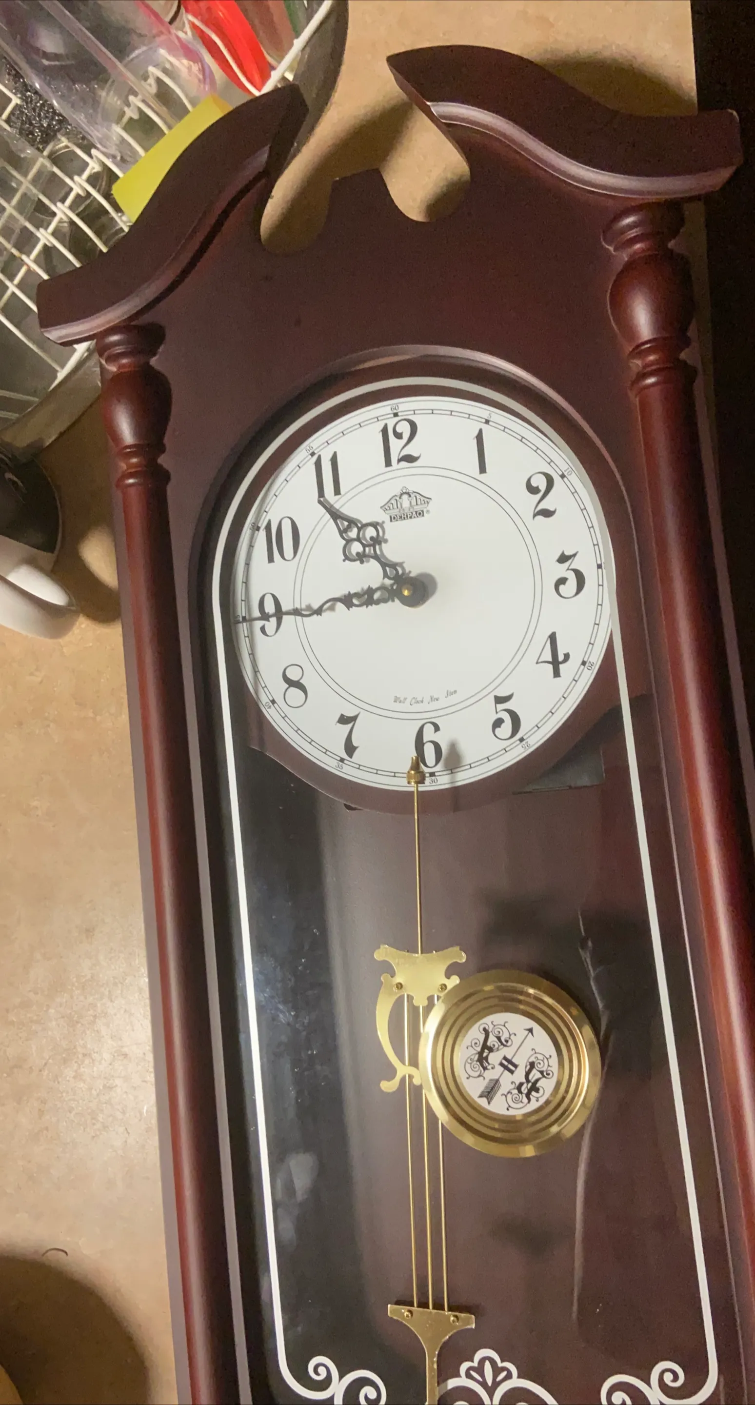 Selling a Dehpao wall clock. It features a classic design with a pendulum. The clock has a brown wooden frame and a white face with black numerals.