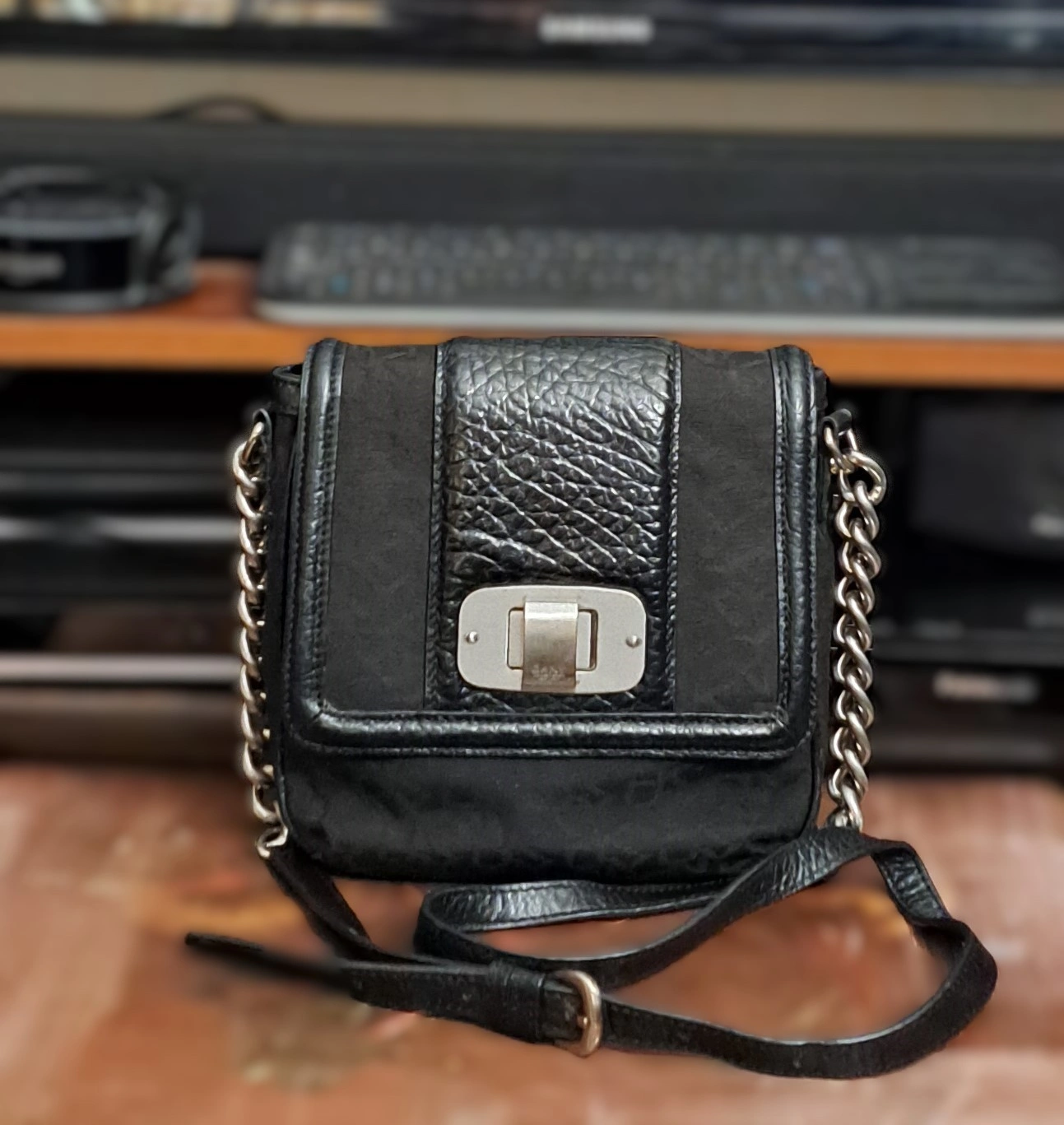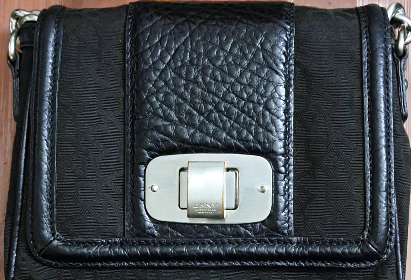 Donna Karan New York [DKNY] is a Genuine American brand made of high quality polyester and leather. Sophisticated black monogram pattern complemented by leather trim. Fashionable design and quality. Interior is clean and organized. Twist Lock Closure has gold-tone edges [last photo]. Overall, the silver-tone accents hardware are good. Great shape. Gently worn and cared for beautifully. Well-kept.