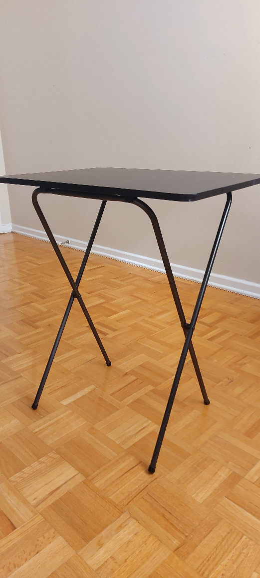 Very handy black folding TV tray table! Perfect for snacks, meals, or working from the couch. It's in great shape and folds up easily for storage when you're not using it
