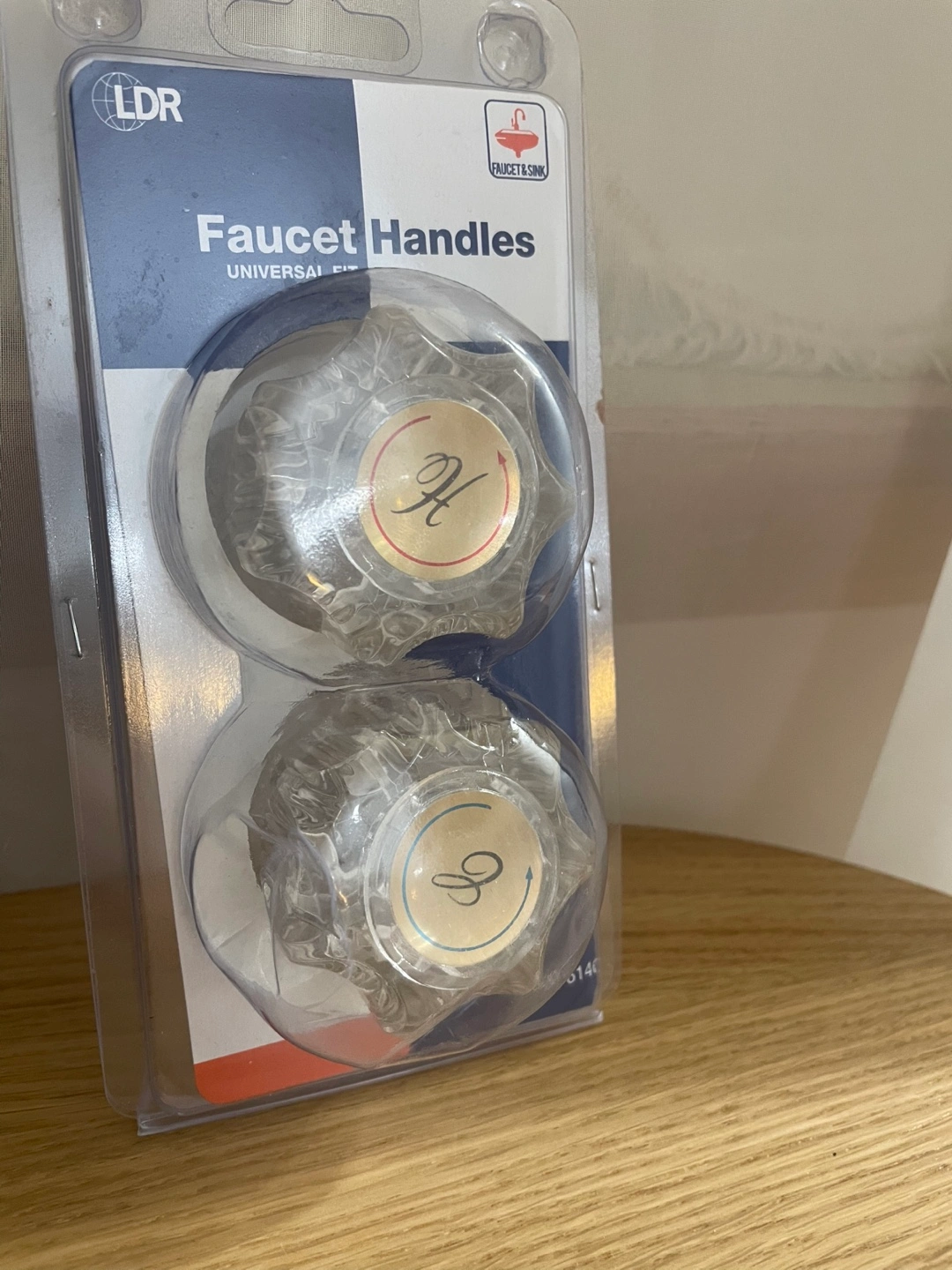 Selling a new set of LDR faucet handles, still in the original packaging! These universal fit faucet handles are perfect for updating your sink or tub. They're clear and would match any bathroom decor.