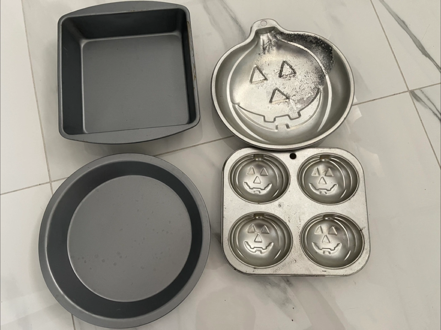 Selling a set of baking pans! Includes a square pan, a round pan, a pumpkin-shaped pan, and a muffin pan with pumpkin faces. Great for fall baking!