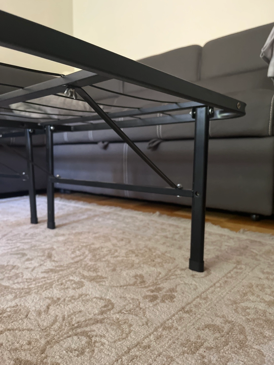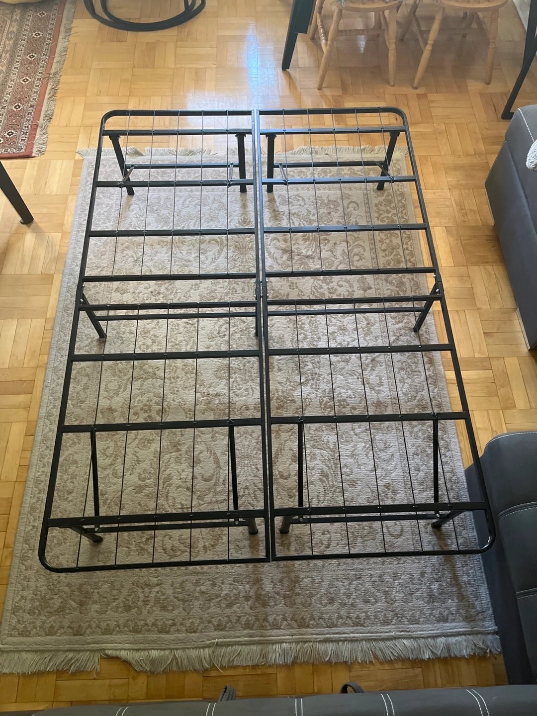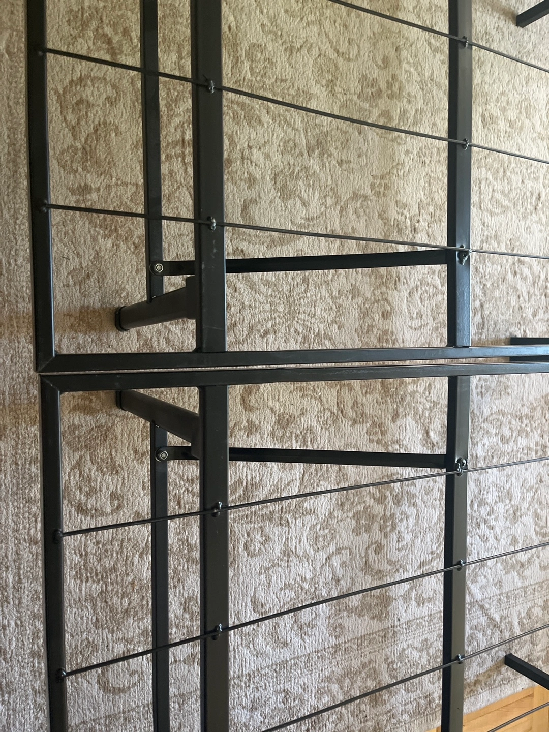 Selling a bed frame in good condition! It's a sturdy, black metal frame that's easy to assemble. Perfect for any bedroom setup