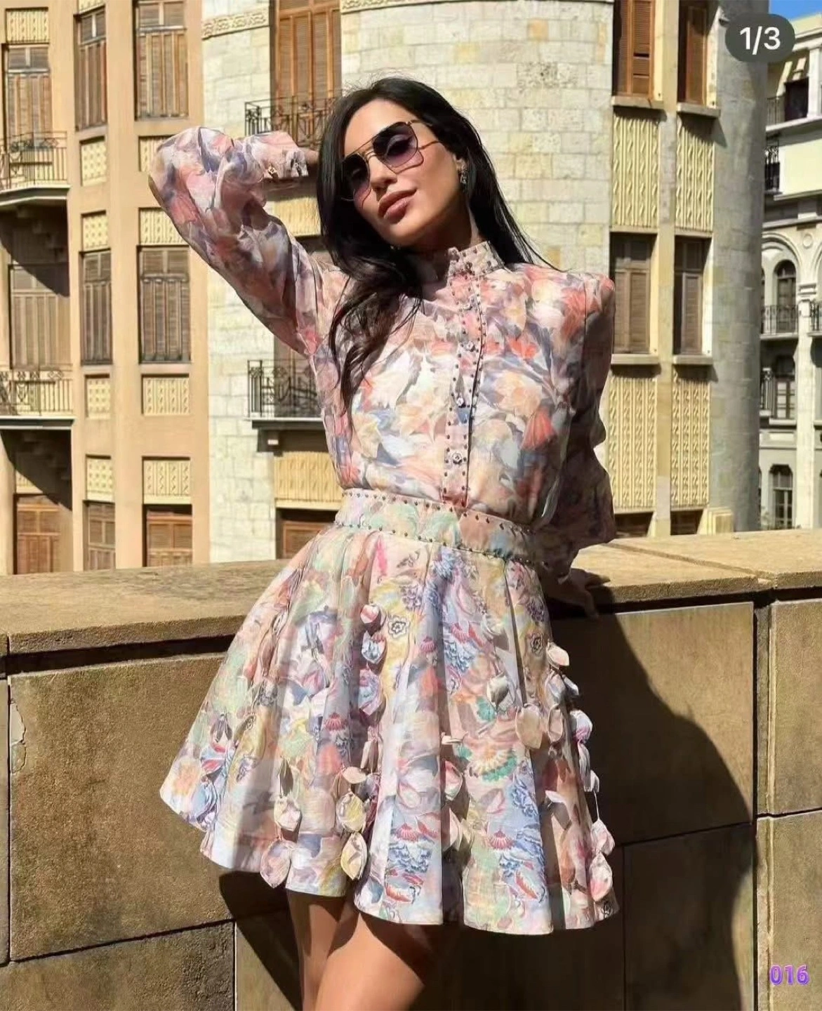 Selling a beautiful floral print skirt and blouse set. The set features a high-neck blouse with button-down detailing and a matching flared skirt with unique embellishments. Perfect for a special occasion or a stylish day out!