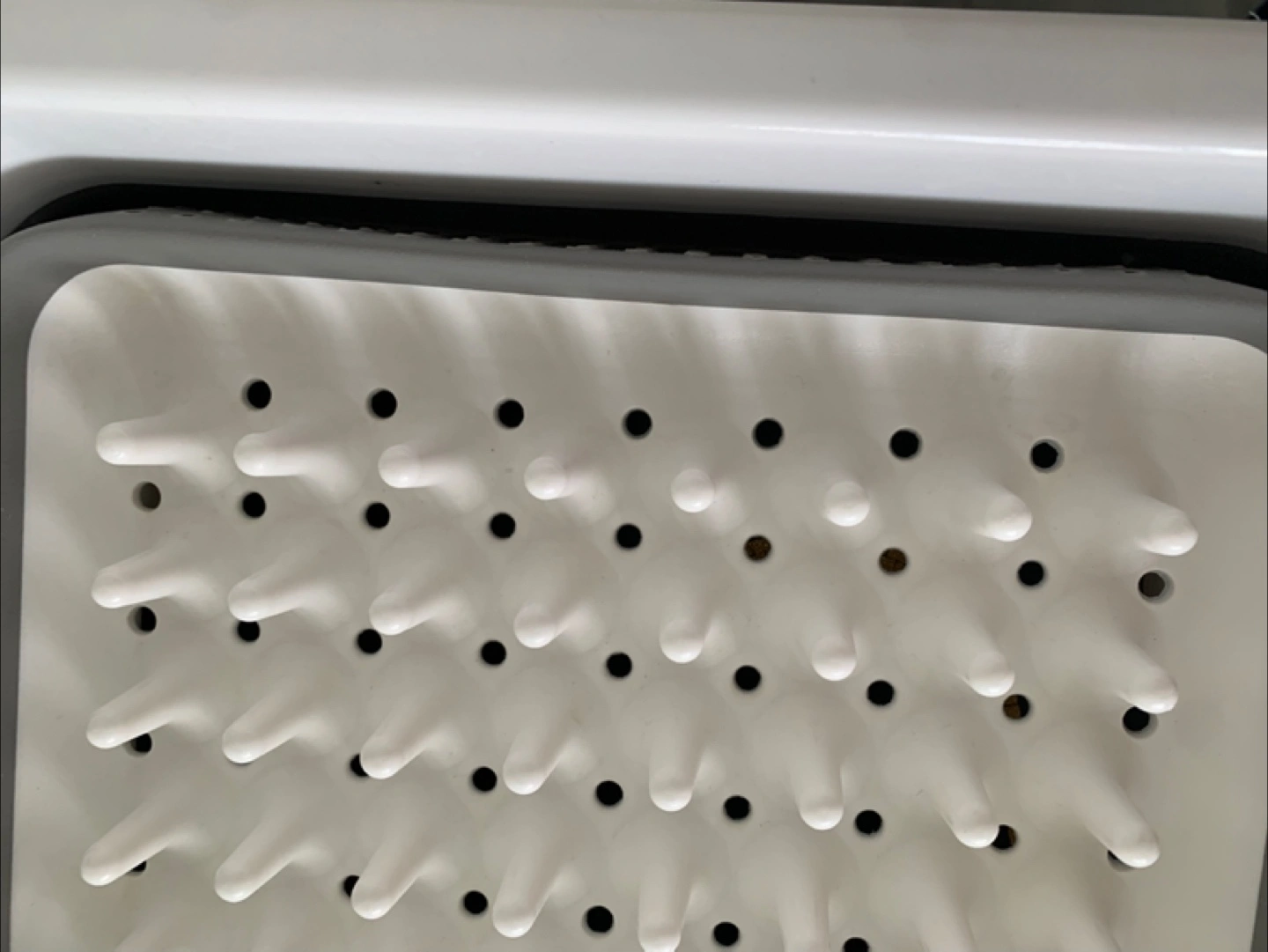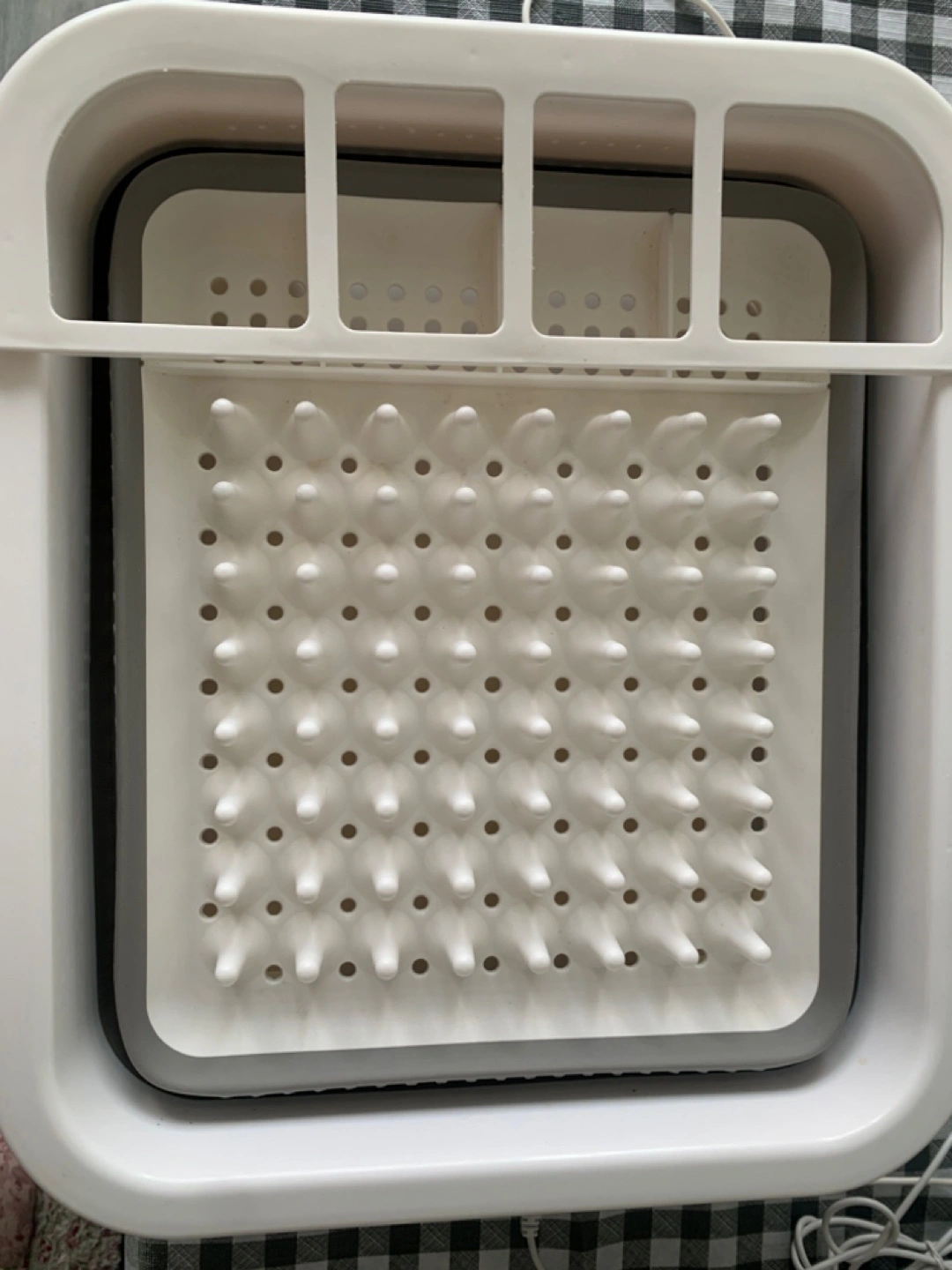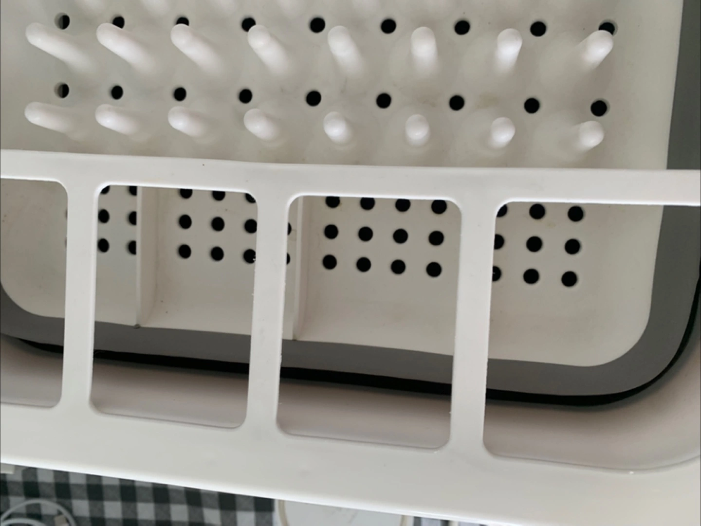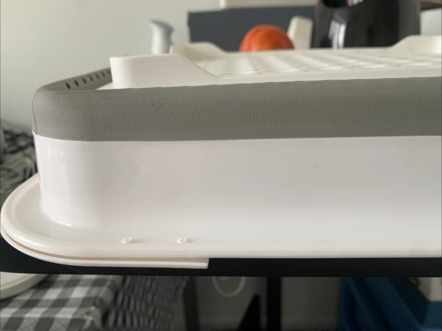 144Selling a dish drying rack in great condition. It's white with grey accents and is perfect for keeping your dishes organized after washing. It features a section for cutlery and is a space-saving solution for your kitchen