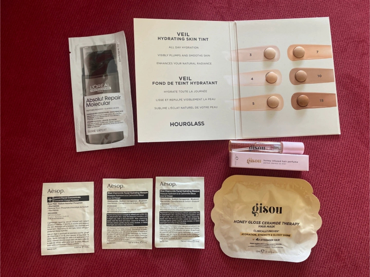 A collection of beauty samples up for grabs! Includes: - L'Oréal Professionnel Absolut Repair Molecular leave-in mask sample - Gisou Honey Gloss Ceramide Therapy Hair Mask sample - Gisou Honey Infused Hair Perfume - Hourglass Veil Hydrating Skin Tint samples - Aesop skincare samples