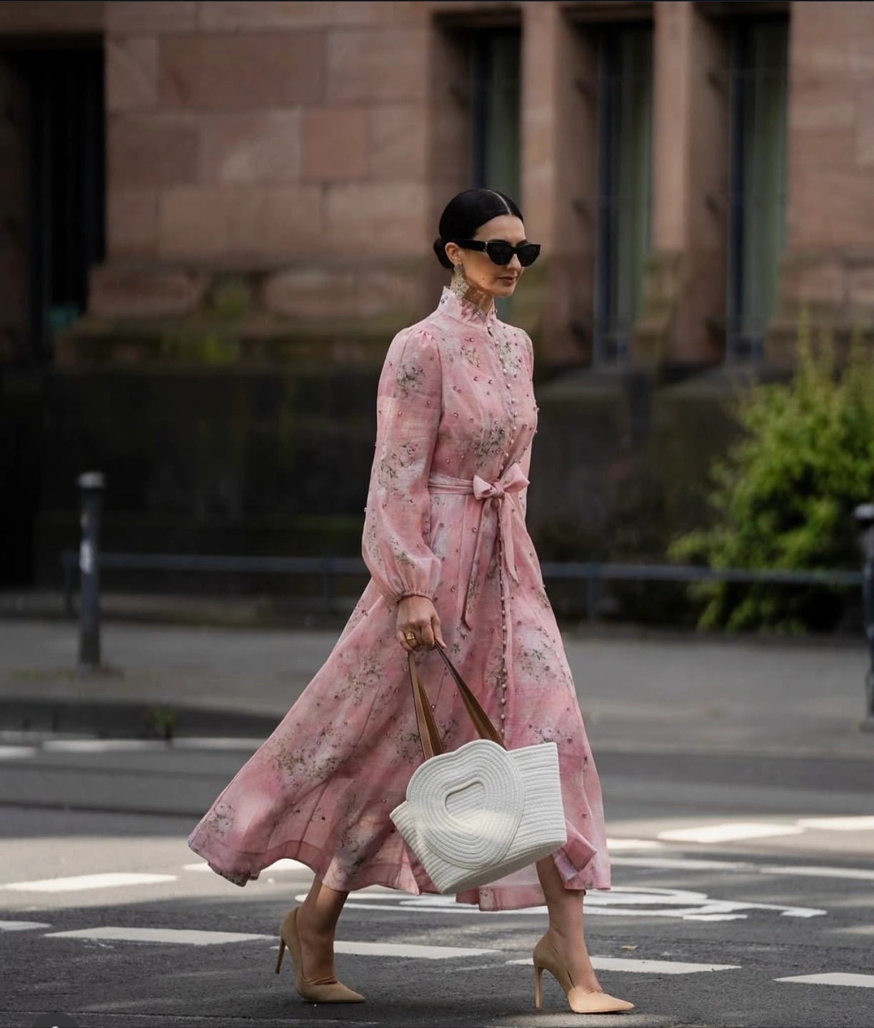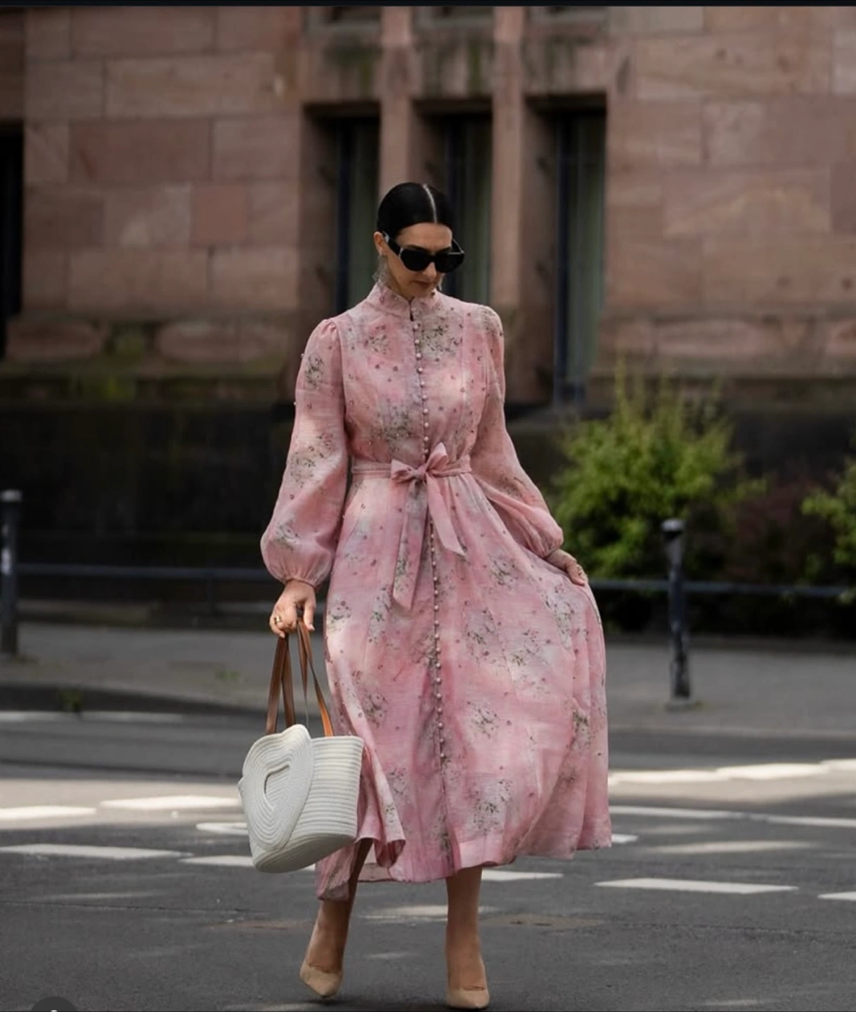 Selling a beautiful pink floral maxi dress! It features long sleeves, a high neckline, and a delicate floral pattern throughout. Perfect for a special occasion or a stylish everyday look!