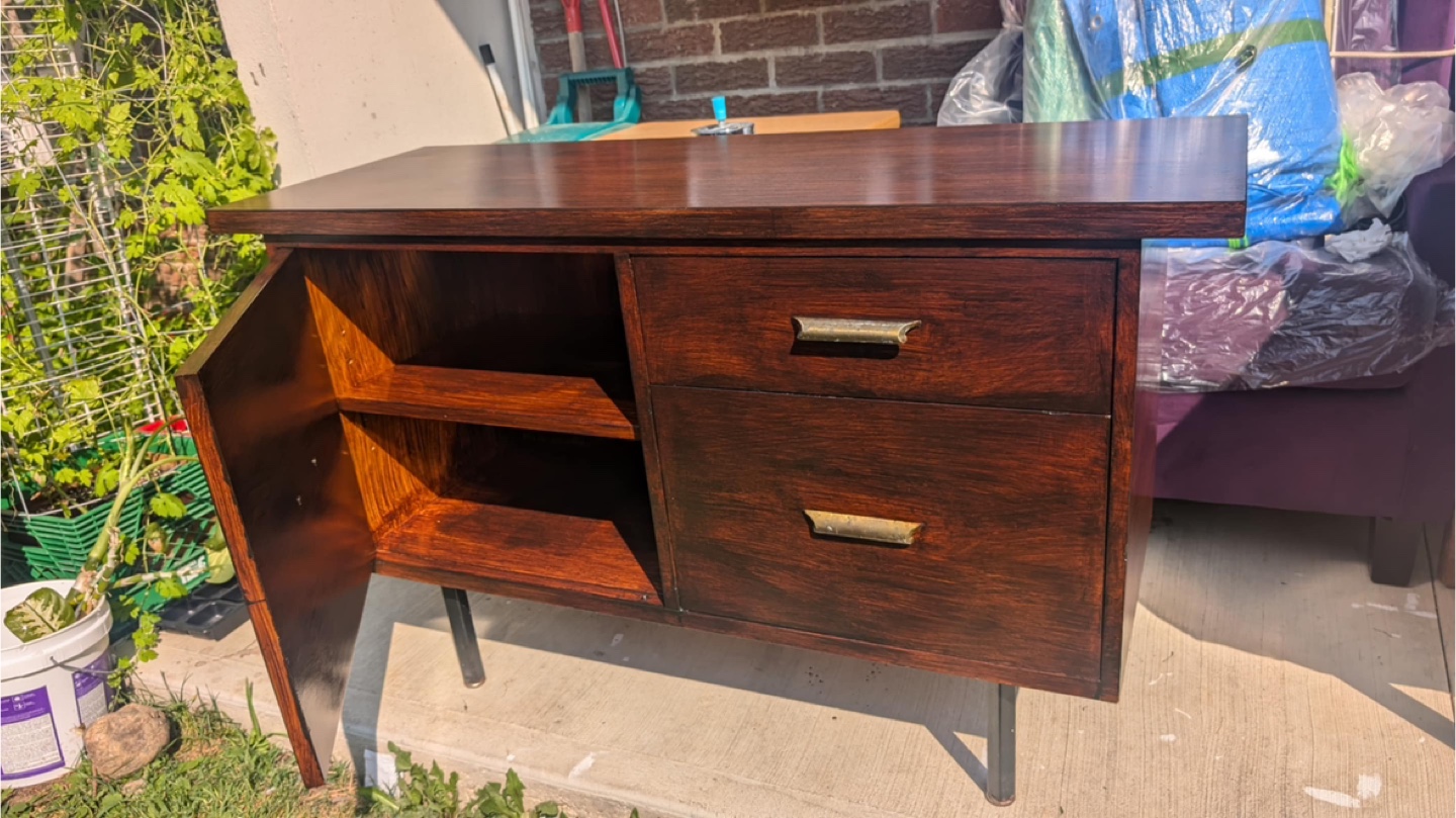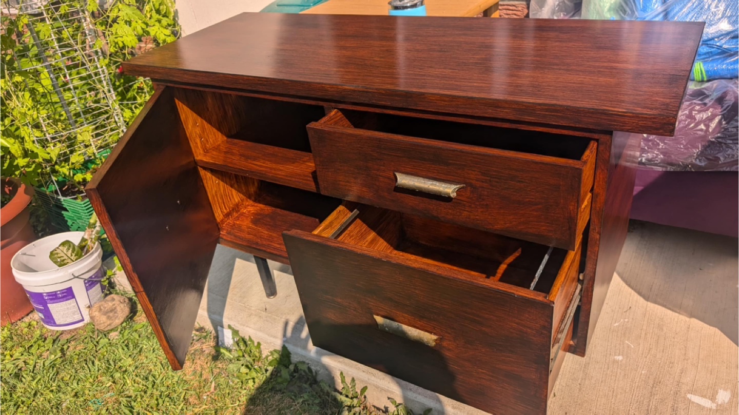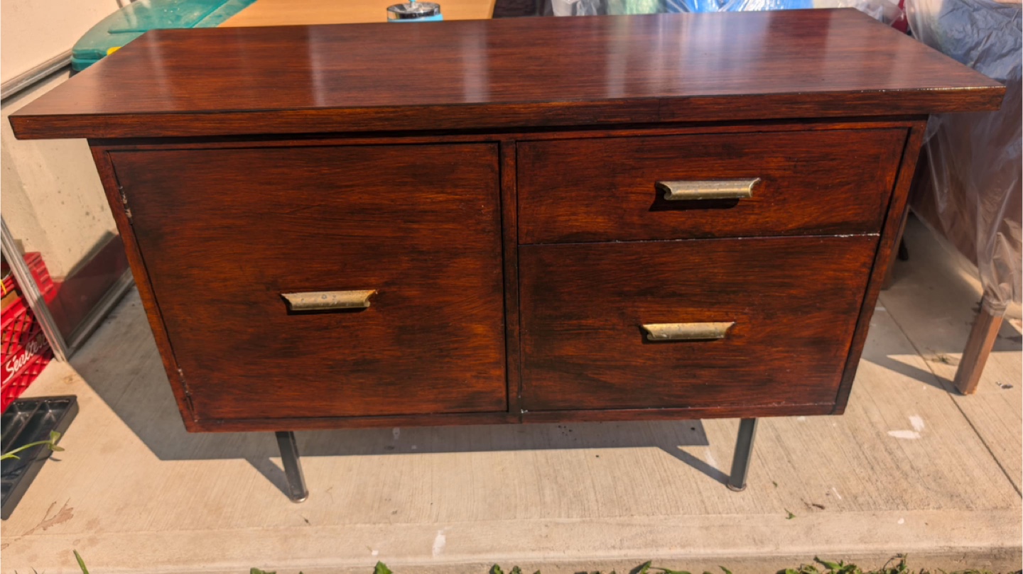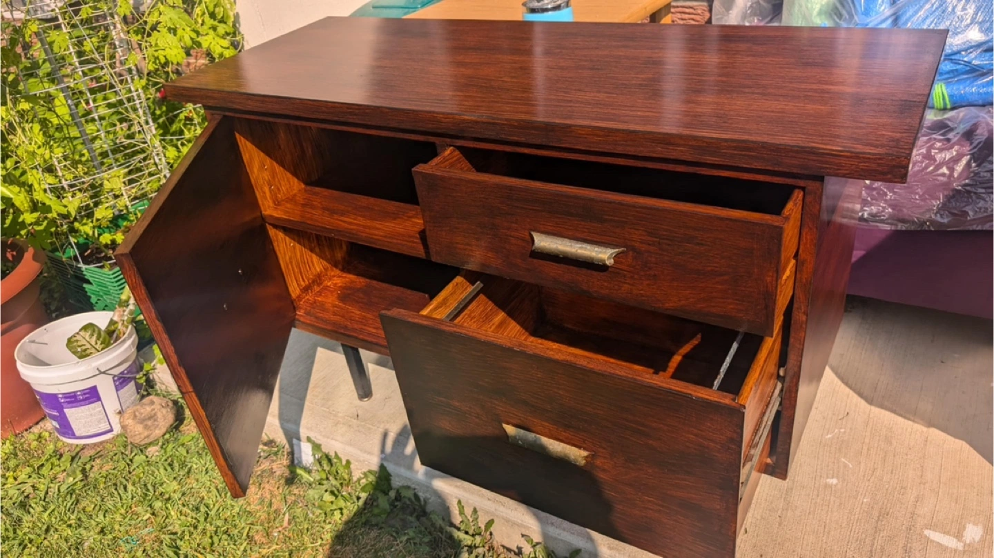 A lovely brown wooden cabinet with a sleek design. It features both drawers and a cabinet with shelving, offering versatile storage options for your home. Perfect for adding a touch of warmth and organization to any room!