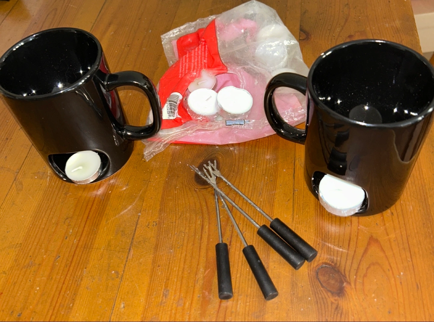 Selling a set of two black fondue mugs, complete with fondue forks and tea light candles! Perfect for a cozy night in or a fun dessert with friends. Enjoy some chocolate or cheese fondue in these cute mugs