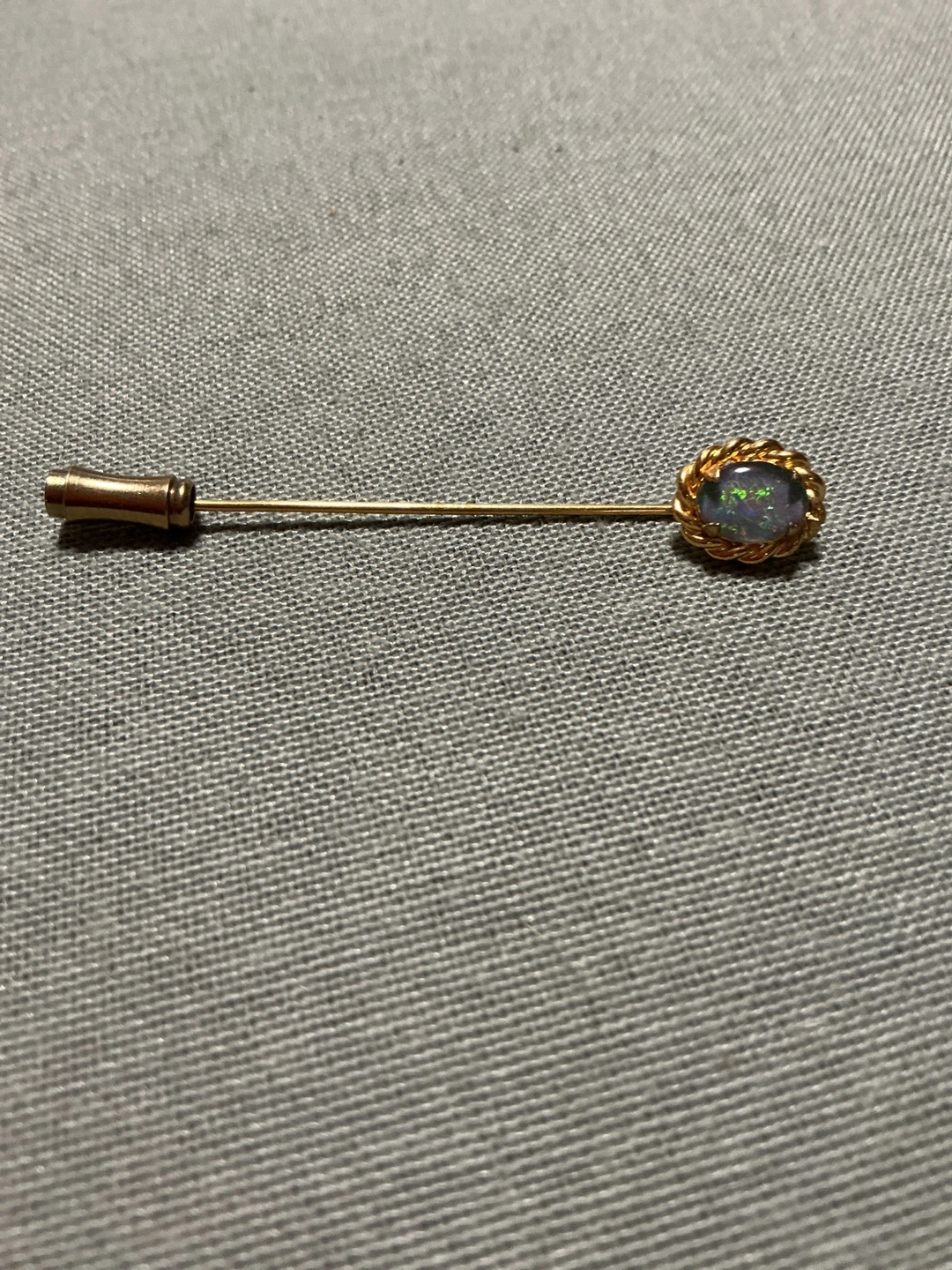 Here's a vintage gold stick pin featuring a beautiful opal. It's a classic piece that would add a touch of elegance to any outfit. The opal has a lovely play of colour. Perfect for collectors or anyone who appreciates vintage jewellery!