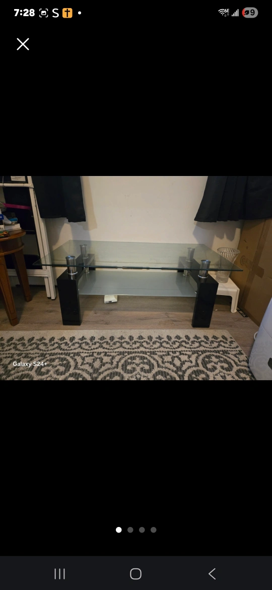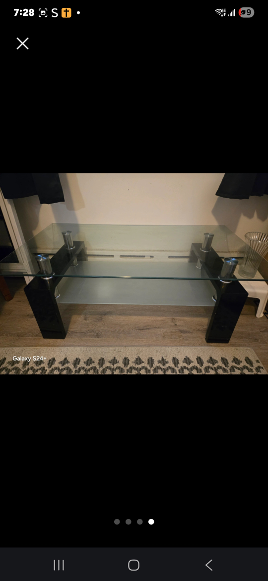Glass coffee table with black legs. It's in good condition and would look great in any living room. If you're interested, feel free to message me! Please if you decide it to pick up, please be serious about it and don't make me waste my time!