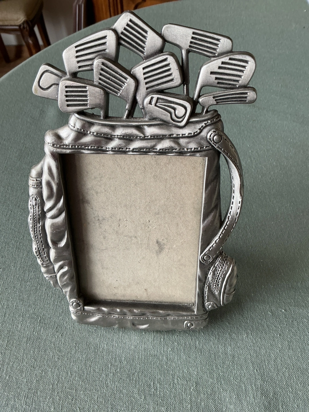 A unique picture frame shaped like a golf bag! It's a charming way to display your favourite memories, especially for golf enthusiasts. The frame is in good condition and ready to add a touch of sporty decor to your home. 3”x5”